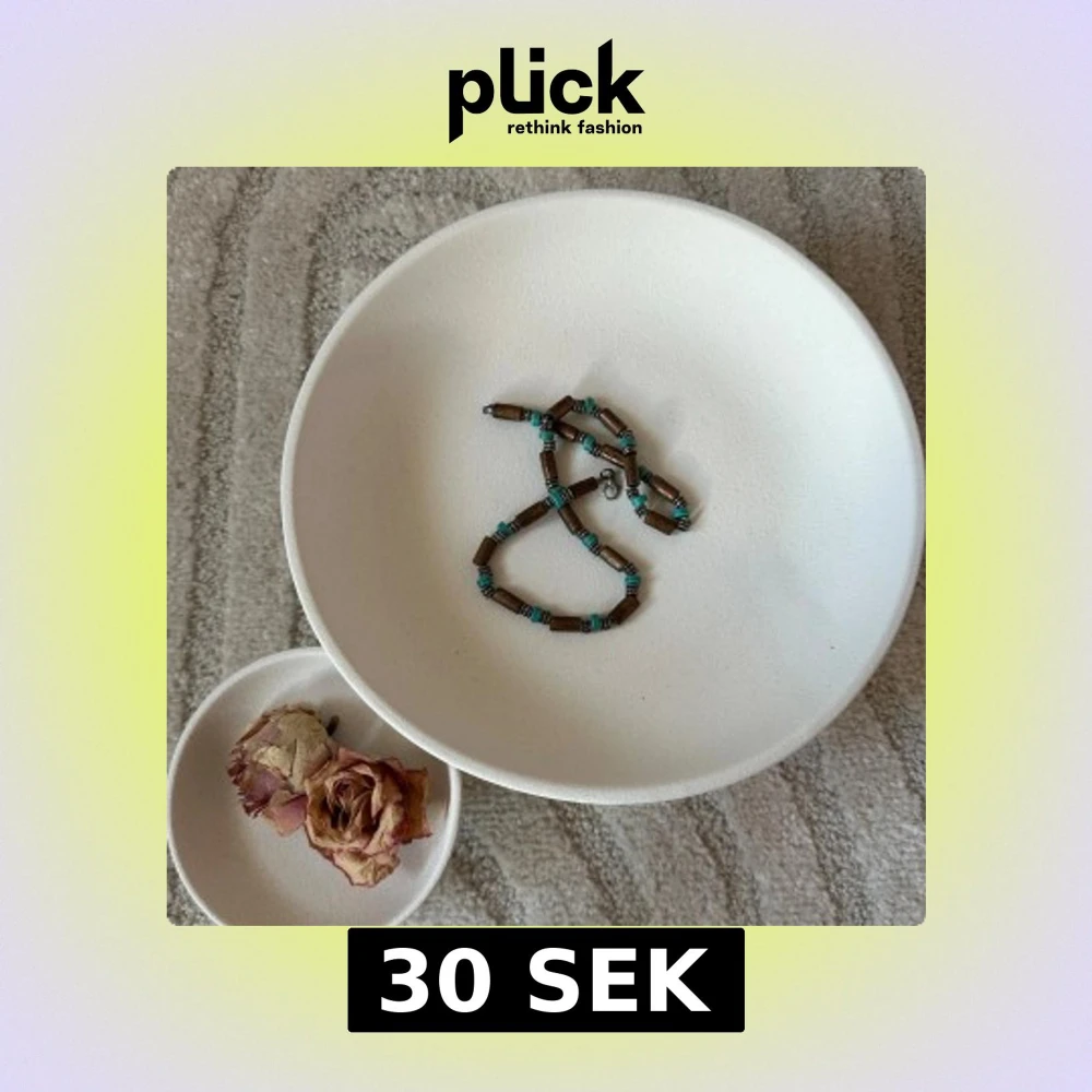 Unikt halsband med avlånga bruna träpärlor, turkosa stenar och silvriga detaljer. Perfekt för dig som gillar boho-stil och naturliga material. Snyggt att bära lager på lager eller som statement-piece.