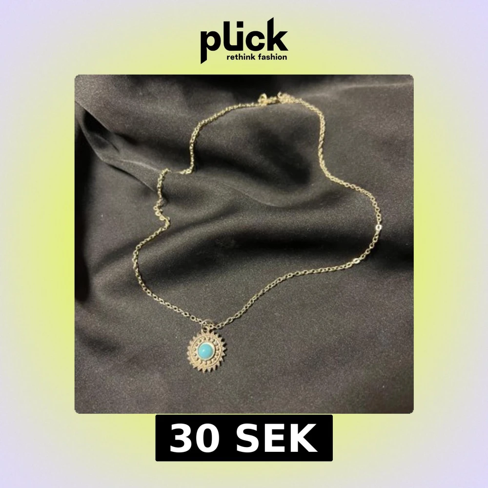 Silverhalsband med ett runt turkost hängsmycke. Hängsmycket har en dekorativ kant som ger en bohemisk känsla. Ej äkta silver