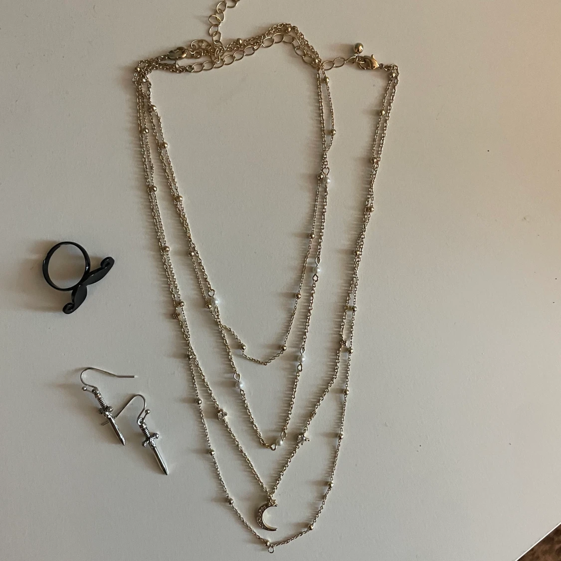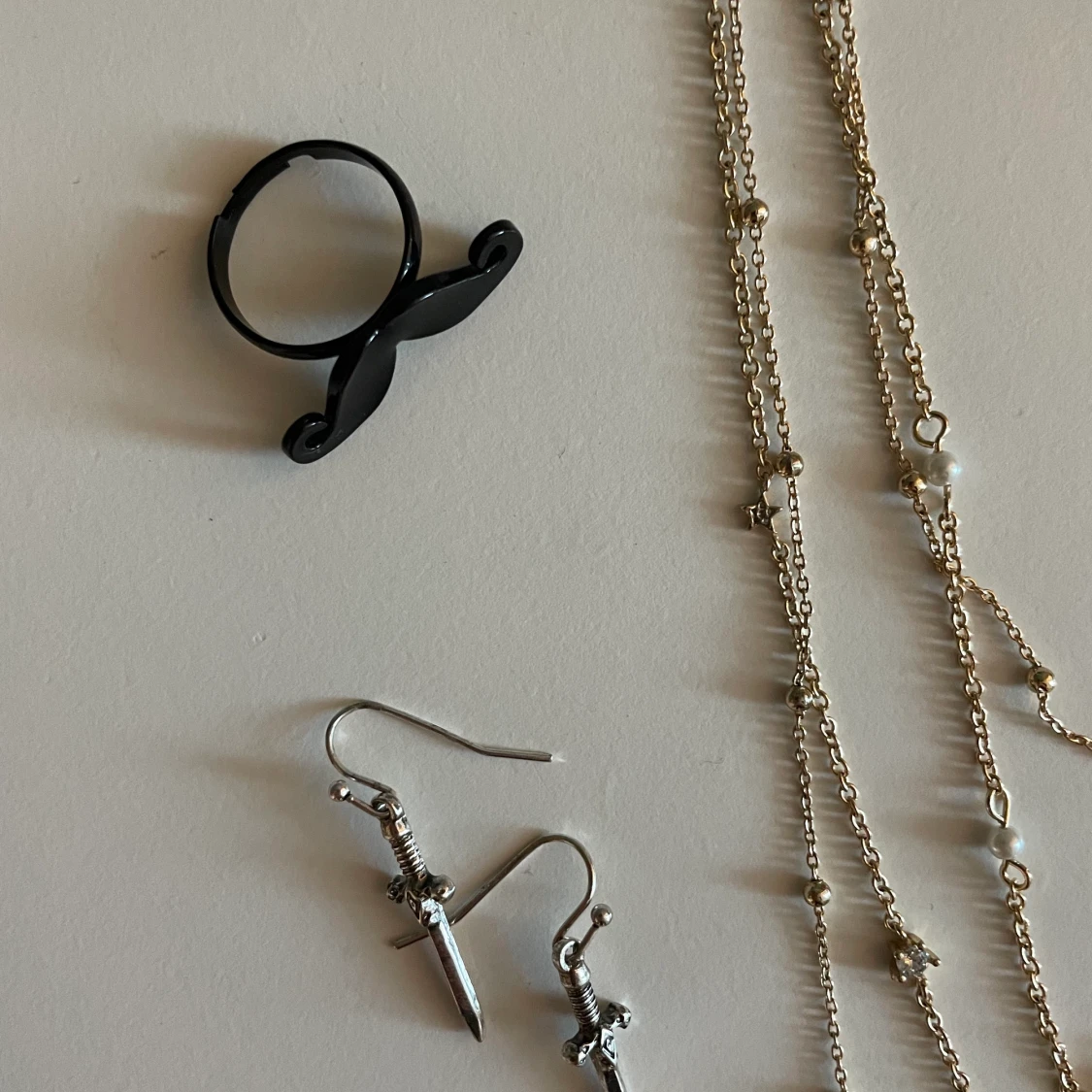 Säljer alla smycken på bilden: ring 15kr, örhängen 20kr halsband 35kr(70kr för allt) knappt använda. Måste inte köpa alla skriv om du vill köpa bara örhänge ex.