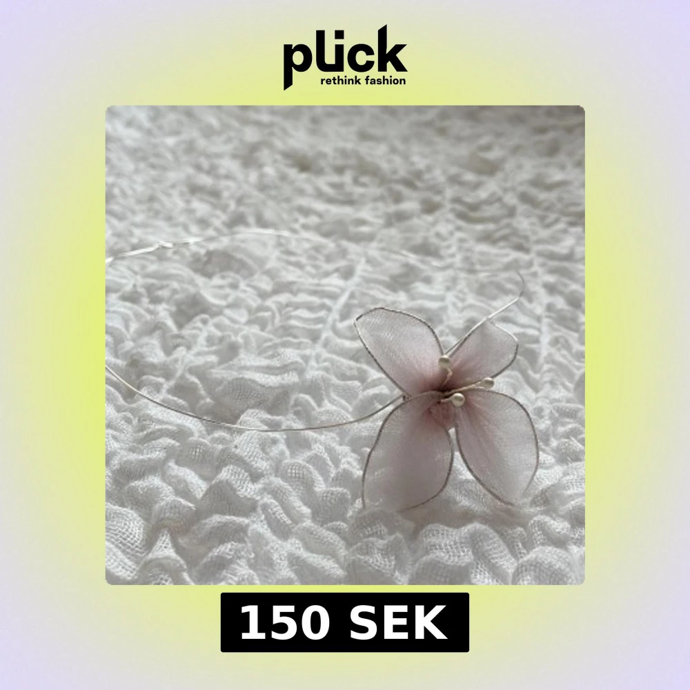 Ett nätt handgjort halsband med en stor, ljusrosa blomma i tyg och tunna vita pistiller i mitten. Blomman har fyra genomskinliga kronblad. Perfekt för en romantisk look.