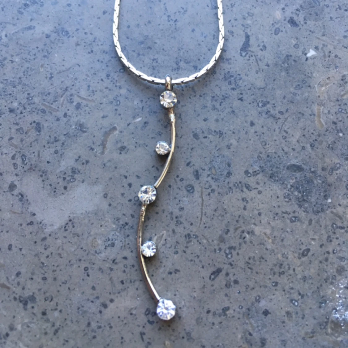Halsband i silver med små kristaller på hängande stav. Frakt 7 kr. Betalning via swish, kontoinbetalning eller via Plick. Kolla gärna in mina andra annonser också. Jag säljer smycken, väskor, sjalar, kläder och skor. Kan samfrakta.
