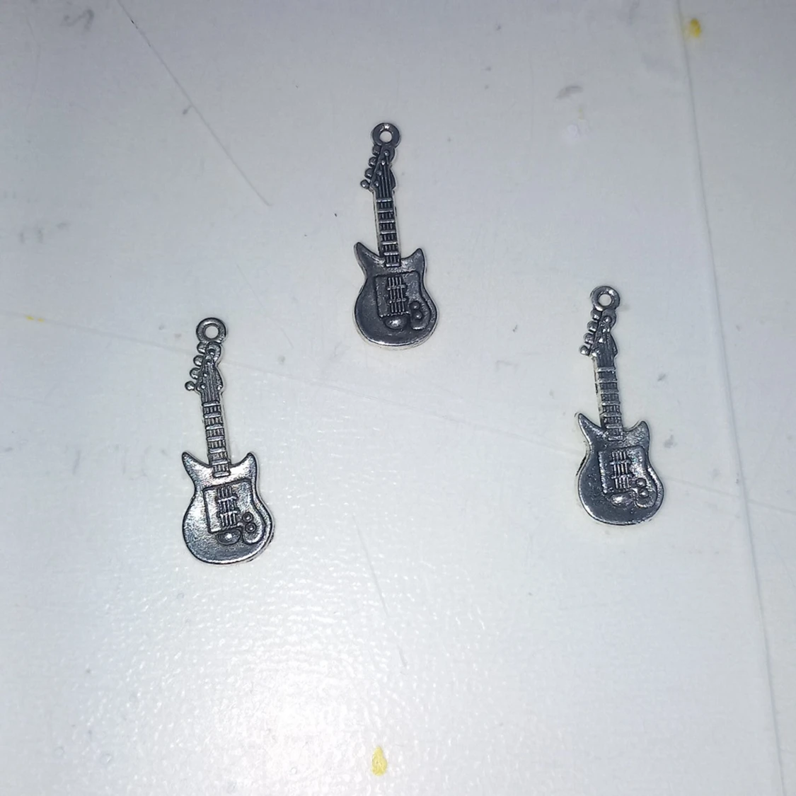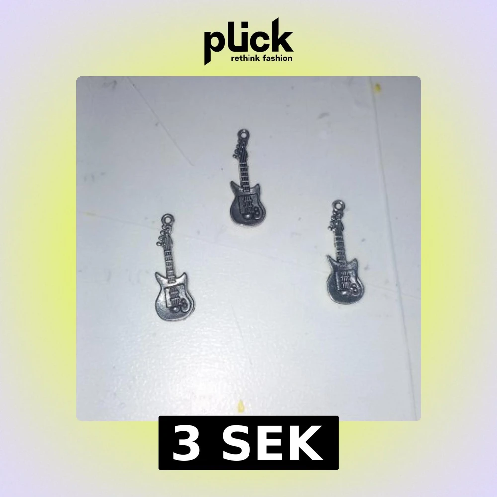 Coolt halsbandshänge i form av en elgitarr, perfekt för dig som älskar musik och vill ha en unik detalj. Hänget är i silverfärgad metall med fina detaljer som strängar och knappar. Passar att hänga på en kedja eller använda som charm.