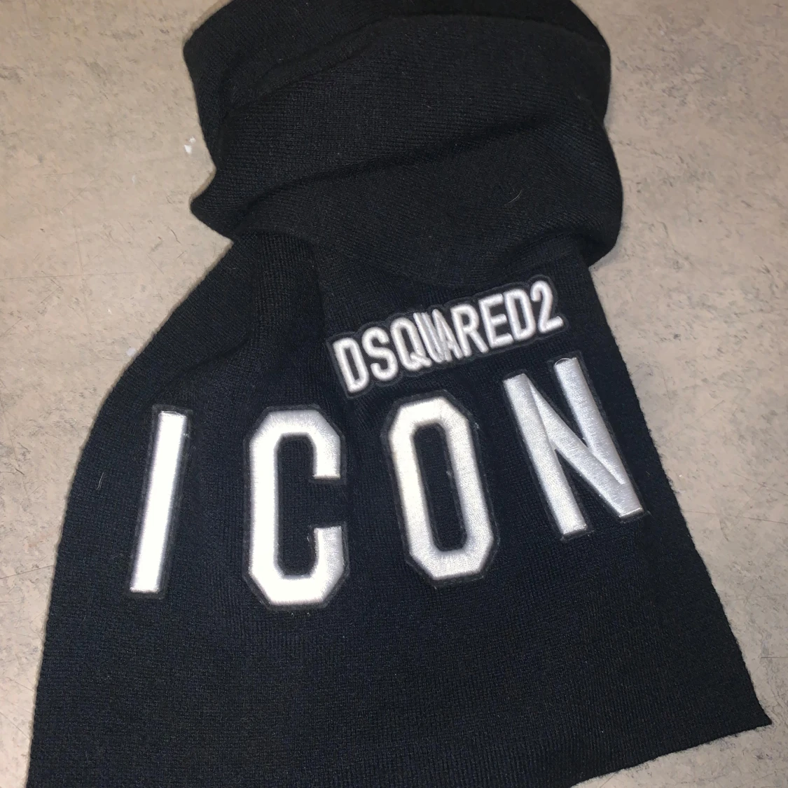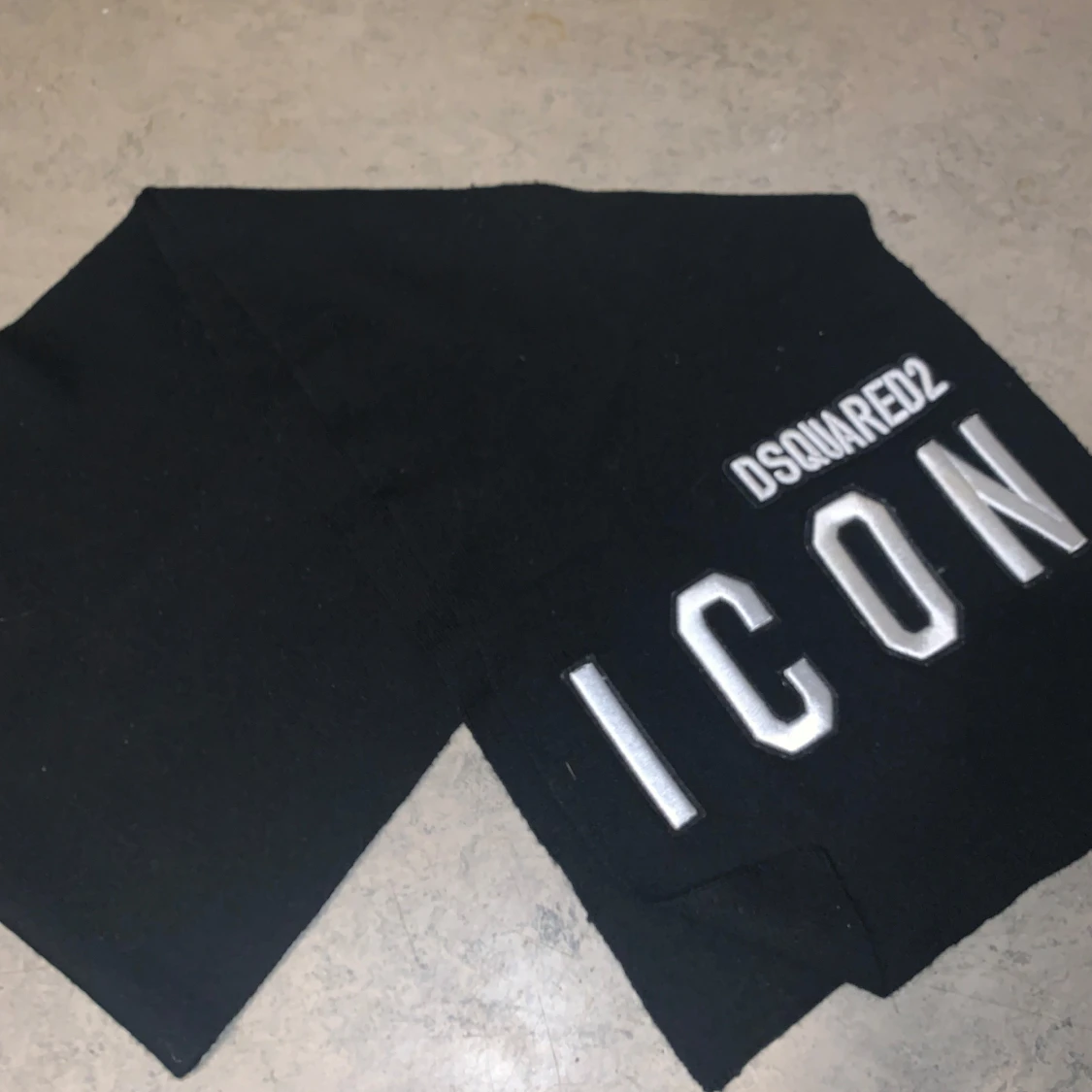 Svart halsduk från Dsquared2 med stor, vit brodyrtext 'ICON' och Dsquared2-logga. Halsduken är stickad och har en clean, rektangulär form som ger en modern vibe. Perfekt accessoar för att lyfta din outfit med en exklusiv touch.