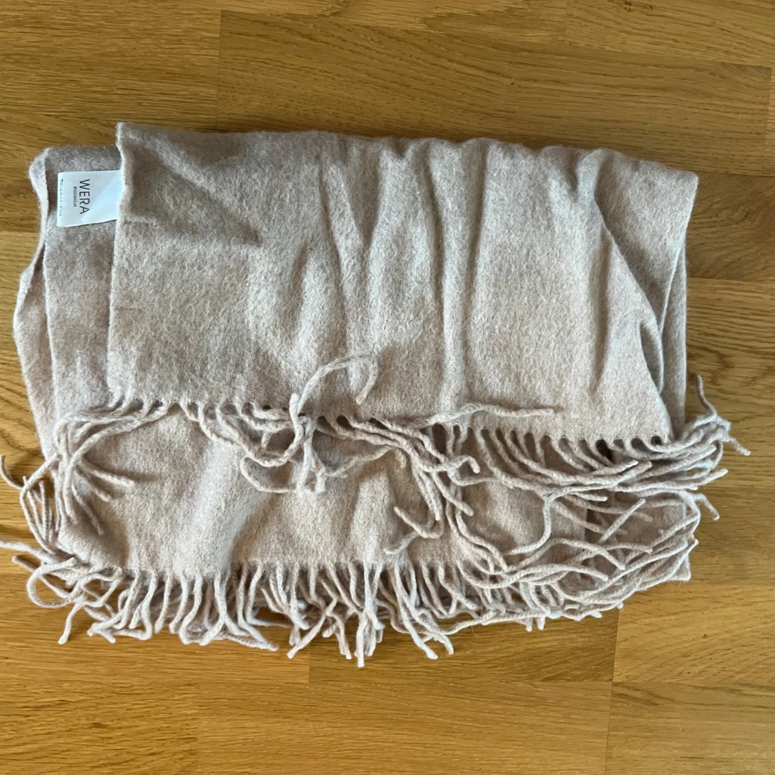 Beige/ljusrosa stor halsduk från WERA i 100% ull. Väldigt mjuk och skön. I mycket bra skick, endast använd ett fåtal gånger.