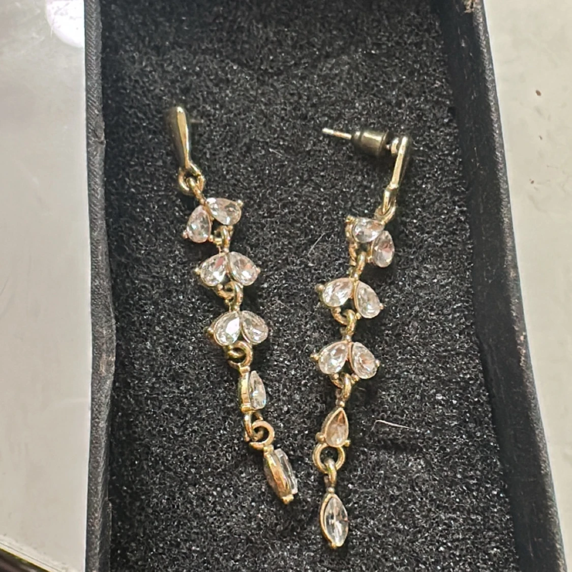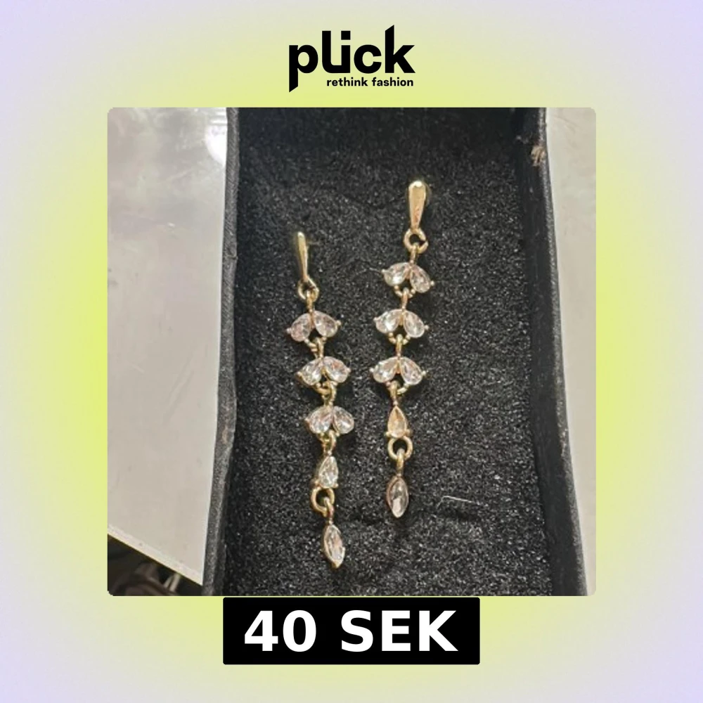 Eleganta guldörhängen med flera glittriga stenar i en hängande design. Perfekta för att ge en touch av glamour till din outfit. De har en smidig stängning och en vacker form som fångar ljuset fint. En sten saknas på det högra örhänget därav priset🥰