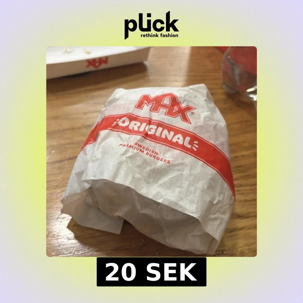 En hamburgare inslagen i papper från Max, märkt med 'Original' och 'Swedish Premium Burgers'. Förpackningen är vit med röd text och logotyp.