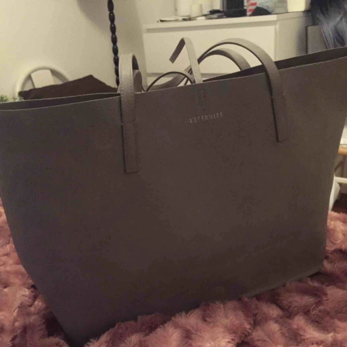 Grå , lätt handväska som rymmer mycket plats och är väldigt enkel .
