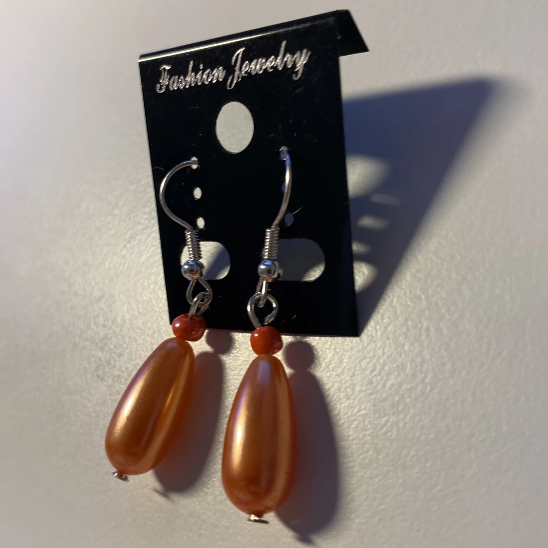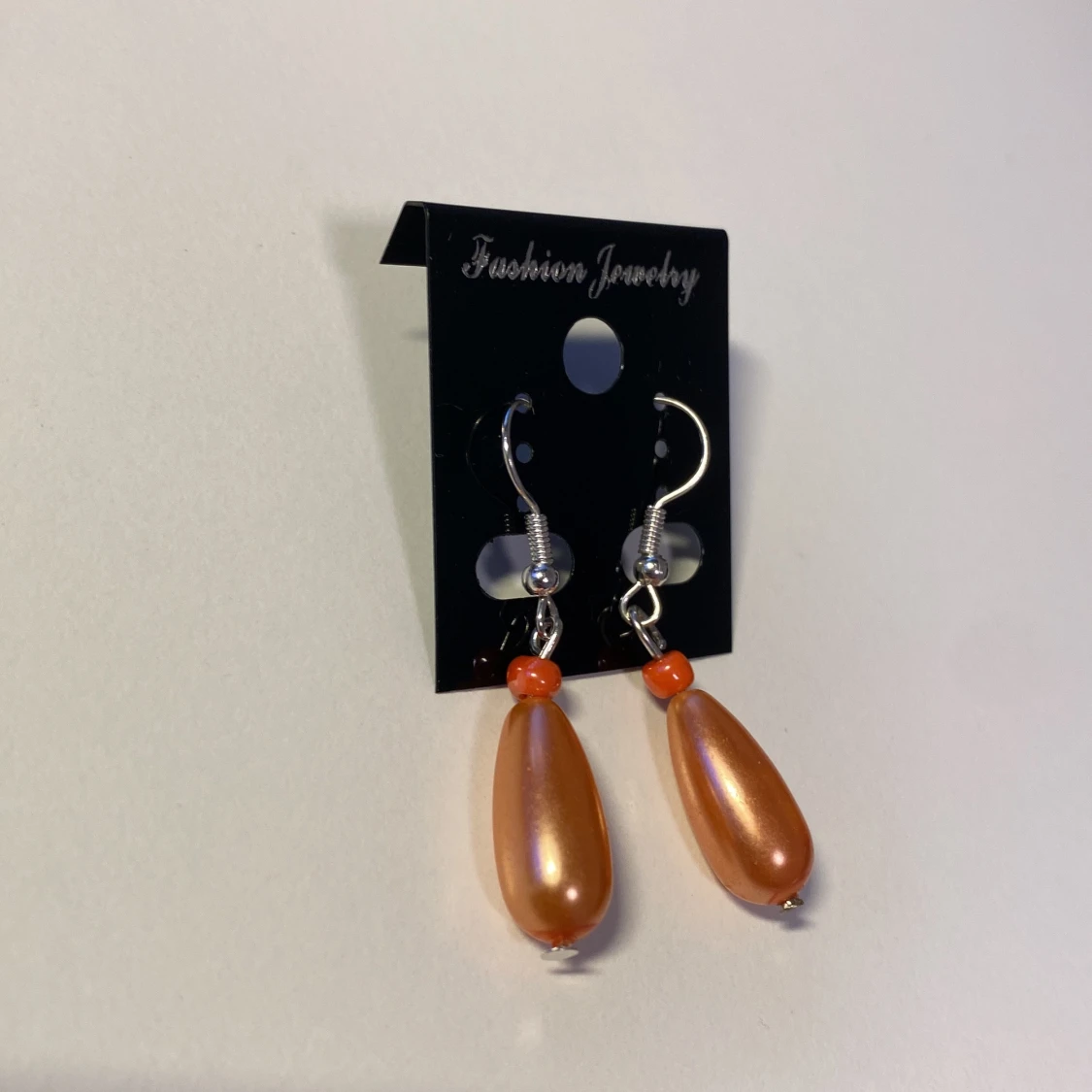 Snygga örhängen med droppformade pärlor i skimrande orange och små runda pärlor upptill. Krokar i silverfärg ger en stilren look. Perfekta för att addera färg till din outfit.