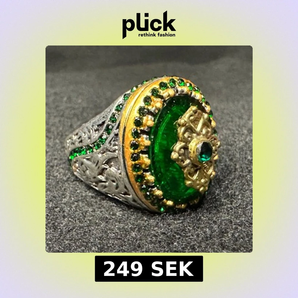Handgjord lyxig turkisk ring. Vackert utsirad med gnistrande grön sten och grön strass. 1,9 cm i innerdiameter, Höjd 2,3 cm.