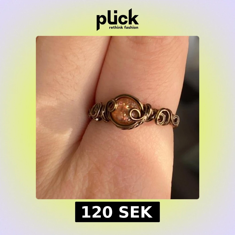 Unik handgjord ring i bronstonad metall med en glittrig orange sten i mitten. Ringen har snygga snirkliga detaljer runt hela bandet som ger den en bohemisk och cool vibe. Perfekt för dig som gillar statement-smycken och vill sticka ut lite extra.