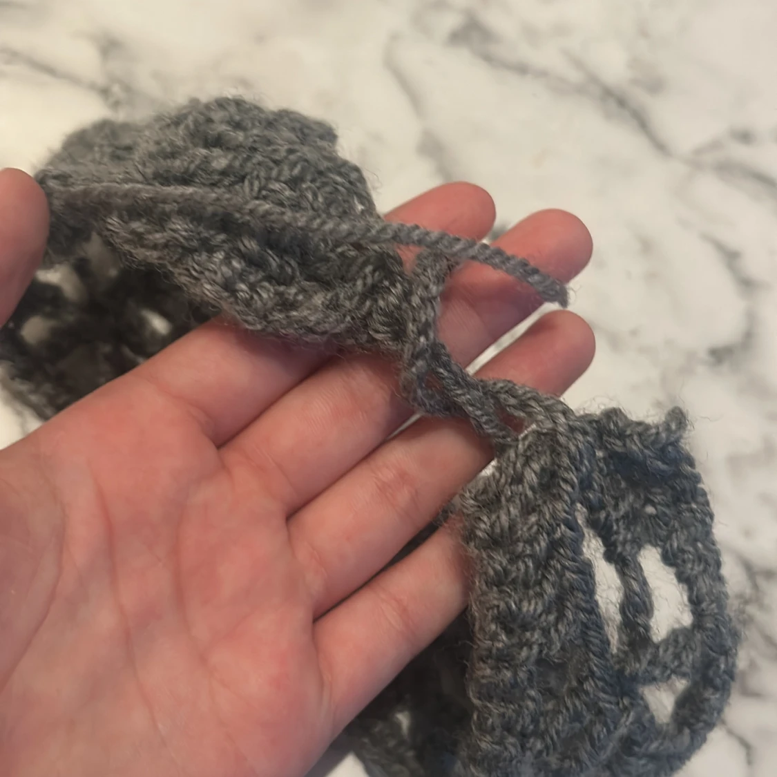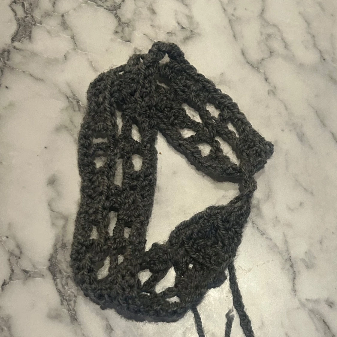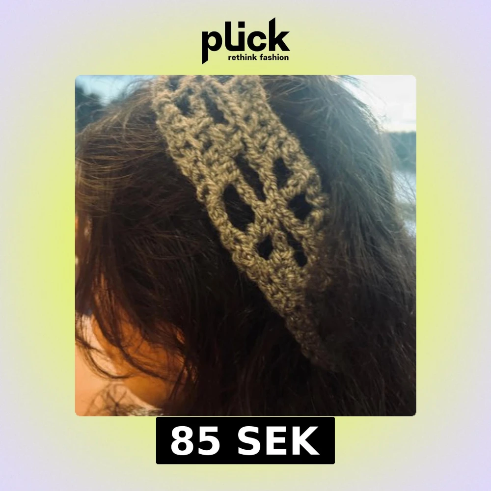 Handgjort diadem i grått garn med snyggt, blommigt mönster. Knyts i nacken genom att trä tråden genom hålet ( visas på näst sista bilden).