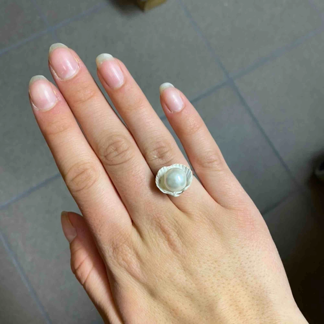 Handjord silvrig ring med äkta snäcka med en vit pärla i. Justerbar i storleken