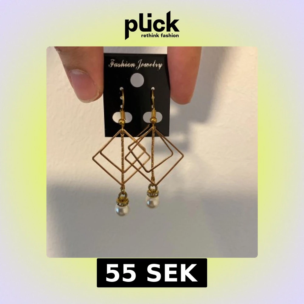 Snygga örhängen i guldton med geometriska fyrkanter och hängande vita pärlor. De har en cool, modern design med dubbla fyrkanter och små glittriga detaljer ovanför pärlan. Perfekta för att lyfta din stil med en unik touch.