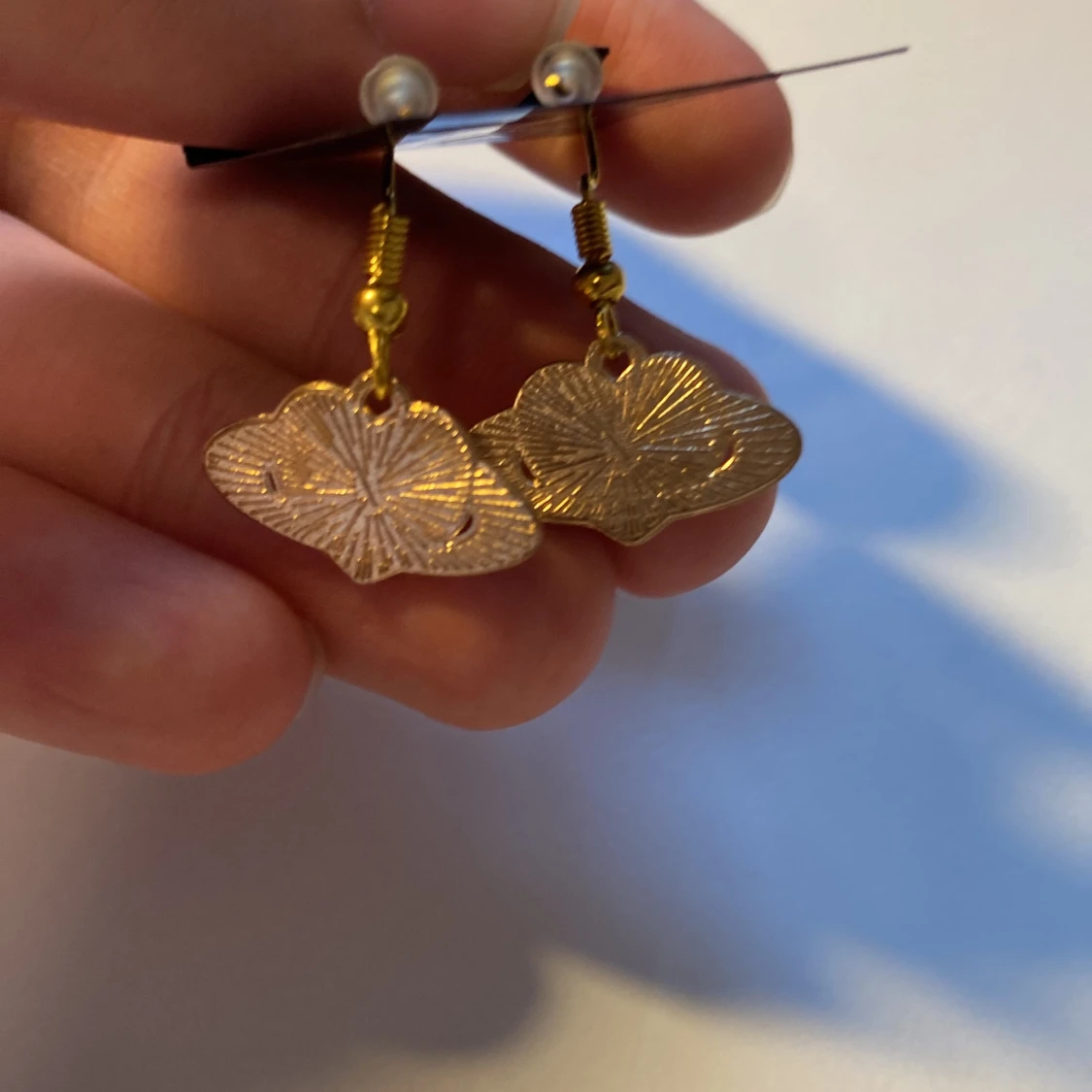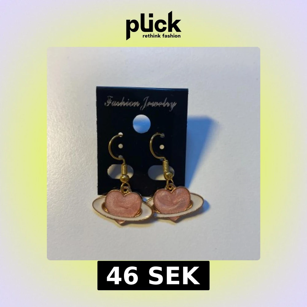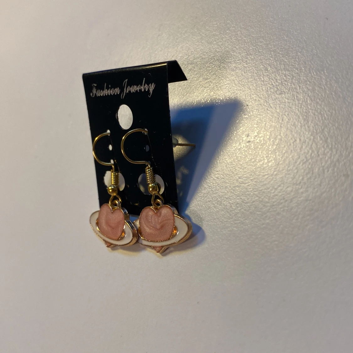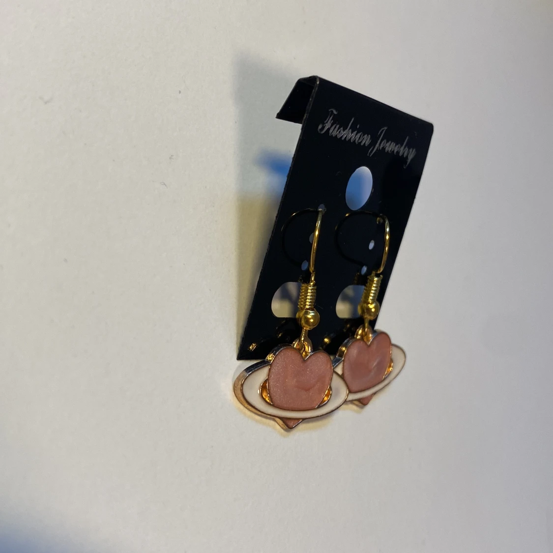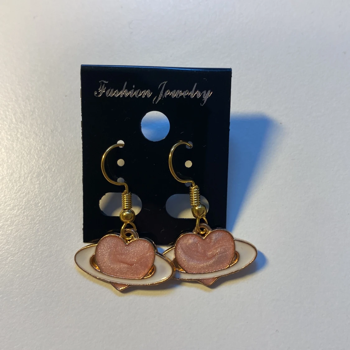 Handgjorda örhängen med guldiga krokar och rosa hjärtan med en vit ring runt, som en planet. Baksidan är helt guldig med graverat mönster. Perfekta för dig som gillar unika och söta accessoarer.