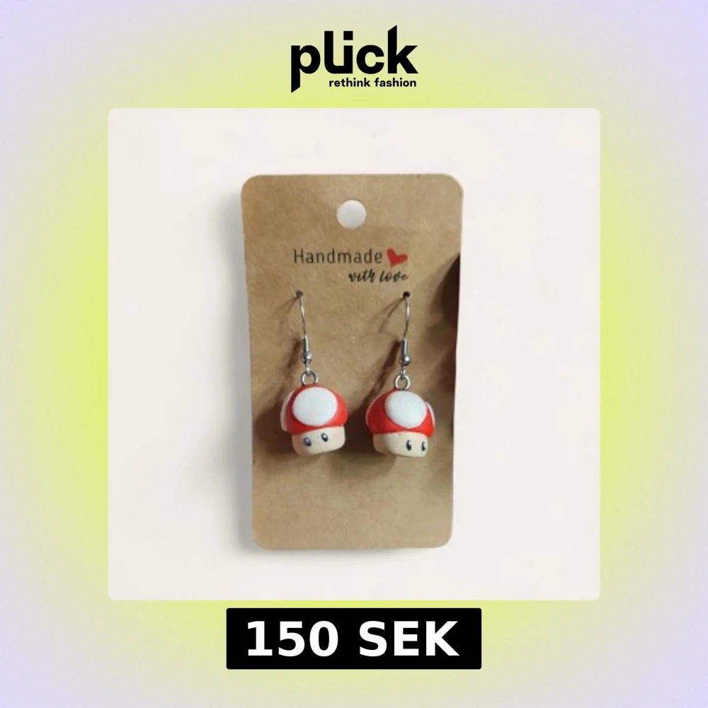 Unika handgjorda örhängen formade som söta svampar ifrån Super Mario. Örhängena har små ansikten och hängs på silverfärgade krokar. Perfekt för dig som vill sticka ut med något lekfullt och kreativt.