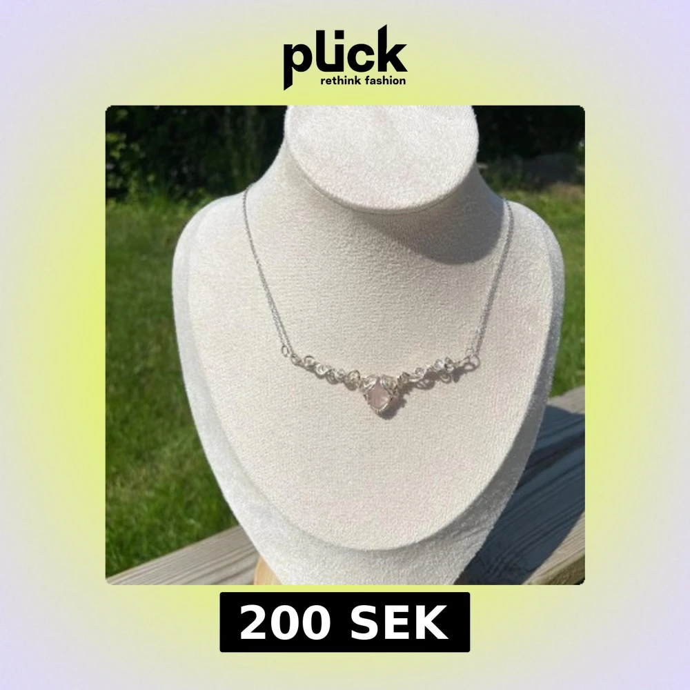 Unikt halsband i silverfärgad metall med en ljusrosa hjärtformad sten i mitten, infattad i snirkliga detaljer. Kedjan är tunn och justerbar med karbinlås. Perfekt för dig som gillar boho eller romantisk stil och vill ha något som sticker ut.