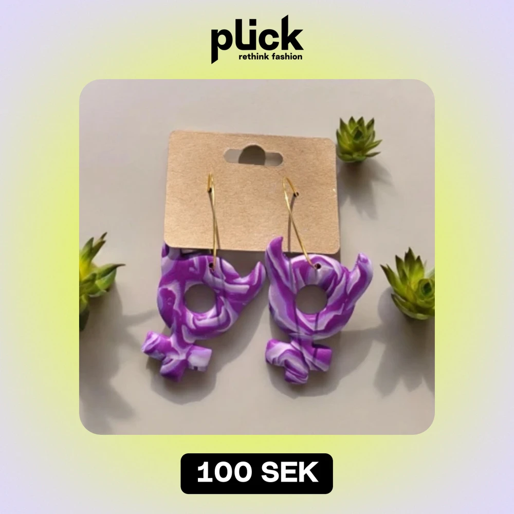 Egentillverkade örhängen av polymer lera. Venus symbol med små horn. Hoops av rostfritt stål. Mycket enkla att byta ut om man så önskar. Putsade och polerade. Naturlig glans. Mycket lätta. Designade och gjorda av mig själv.