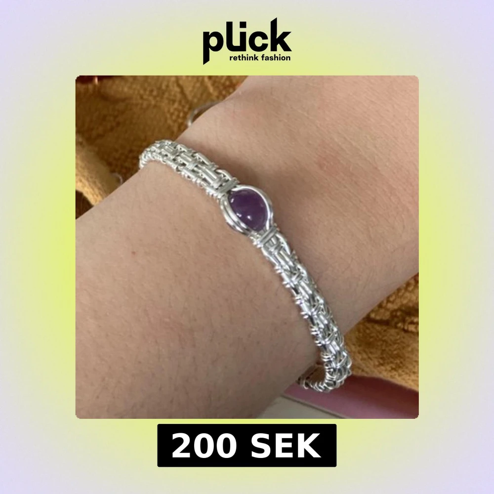 Unikt handgjort armband i flätad silverfärgad metalltråd med en oval, lila sten (ametist) i mitten. Armbandet har en snygg wire-wrapped design och är öppet i ändarna för enkel justering. Perfekt för dig som gillar boho eller statement-smycken.