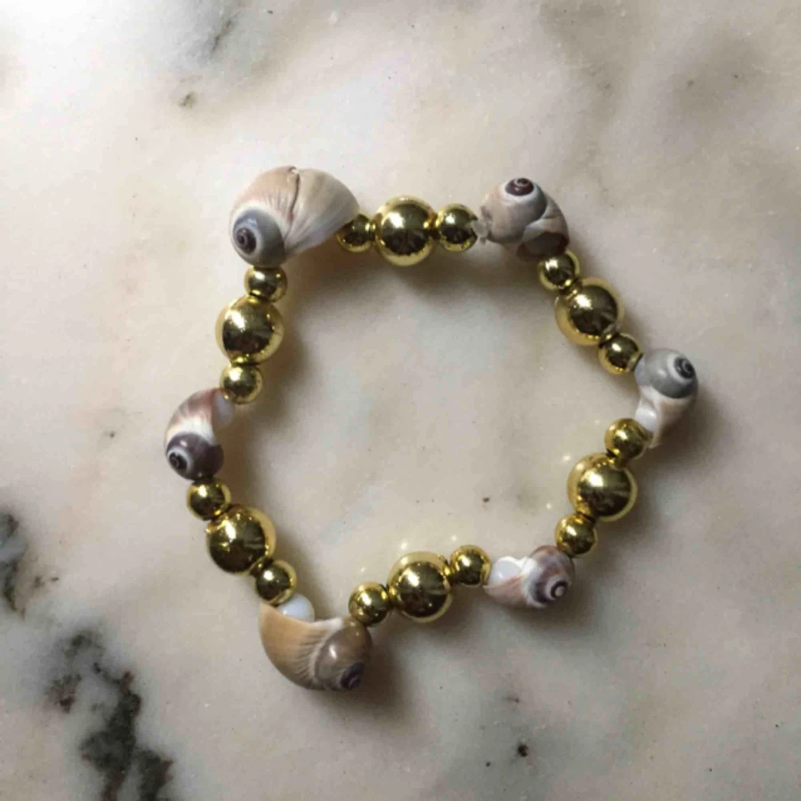 Stretchigt band, gjort av äkta snäckor. Frakten kommer på 9kr och är inräknad i priset.