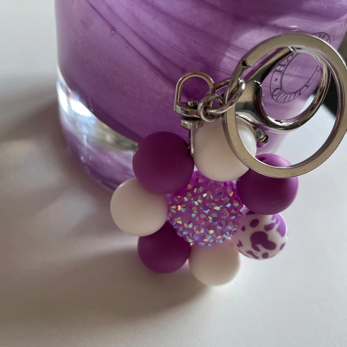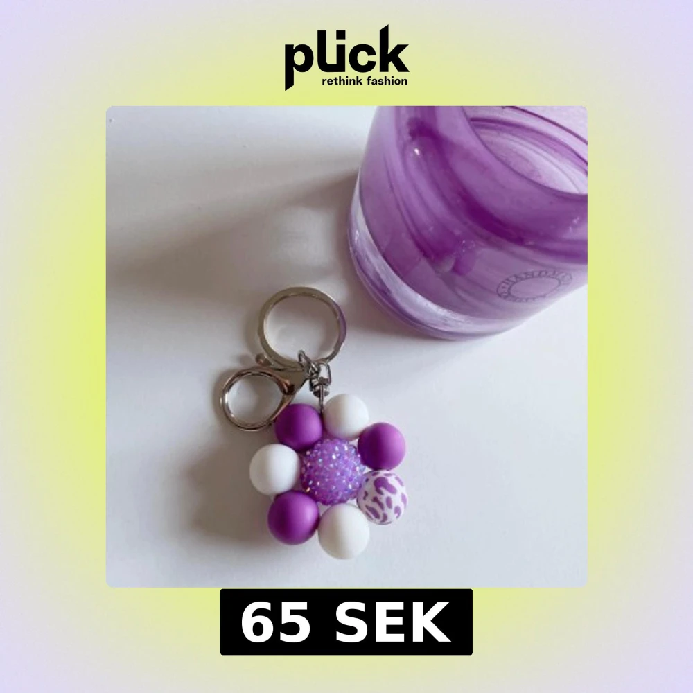 Handgjord nyckelring i lila och vitt med pĂ€rlor i en blommig design. Stilren och lekfull accessoar som passar perfekt för att dekorera dina nycklar eller vĂ€skor. Unik och noggrant tillverkadđ