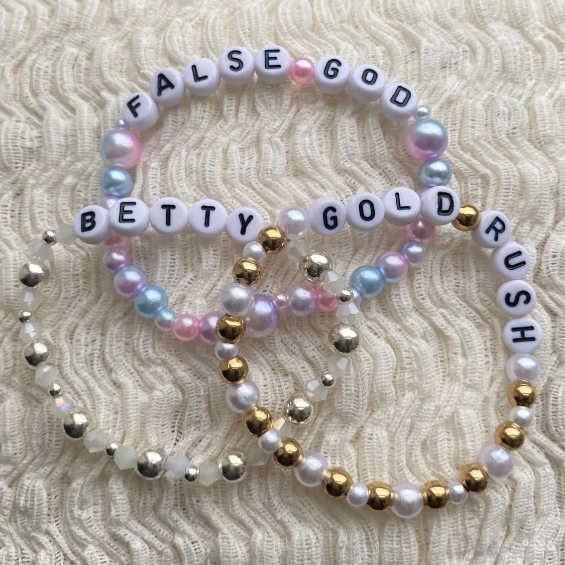 Taylor swift frienship bracelet att behålla för dig själv eller ge bort till andra swifties under the Eras tour. Dessa armband är hemgjorda, elastiska och gjorda för att passa en genomsnittlig handled. För att bevara dem, undvik all kontakt med vatten.