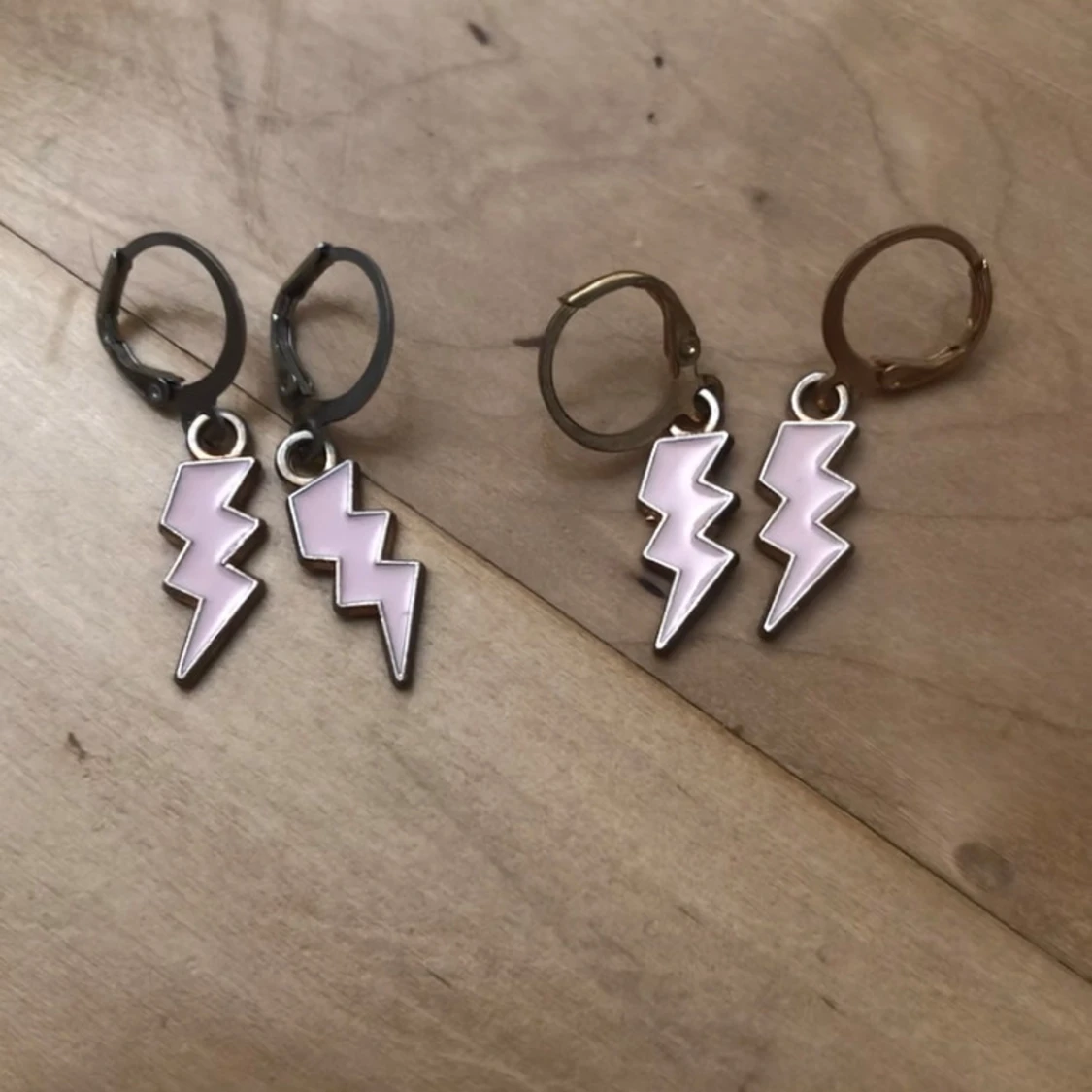 Coola örhängen med blixtformade hängen i ljusrosa och silverfärgad metall. Perfekta för att ge din look en edgy touch. Säljs i par, finns både med guld och silver metallring. Unik accessoar som sticker ut! Priset gäller för ett par örhängen och det finns 16st par i lager. Man kan köpa alla 16 par för 60kr💞