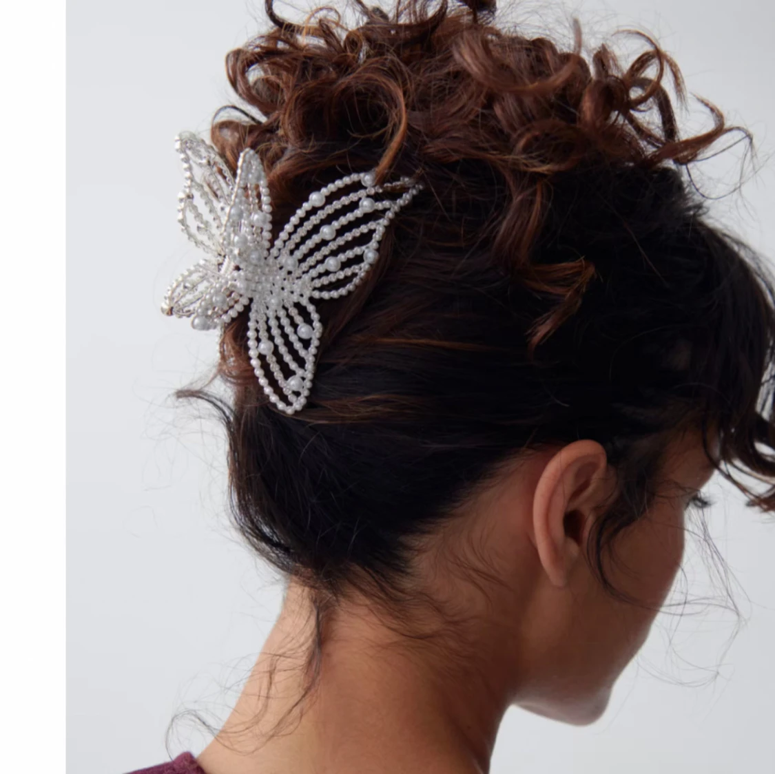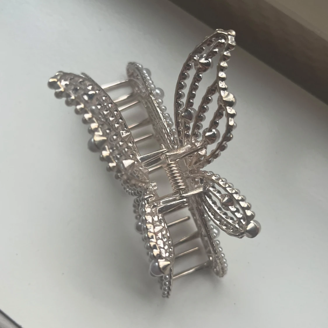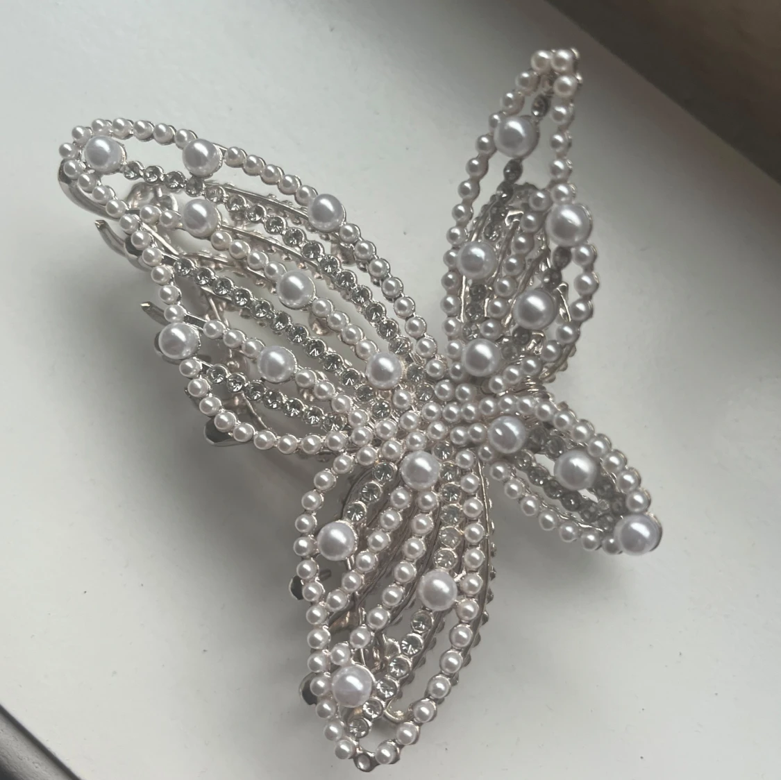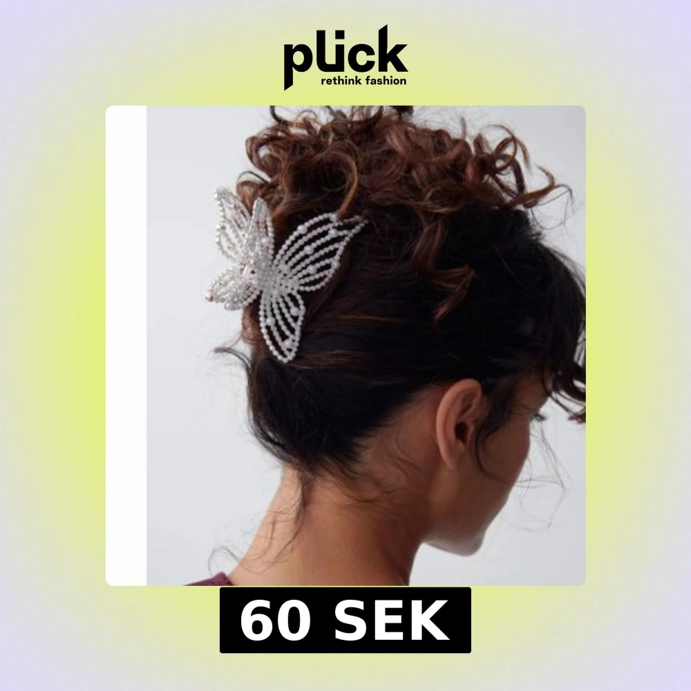Superfin hårklämma formad som en fjäril, dekorerad med vita pärlor och silvriga detaljer. Klämman är stor och syns verkligen i håret. Bara använd en gång, säljer då den inte kommer till användning för mig 💗
