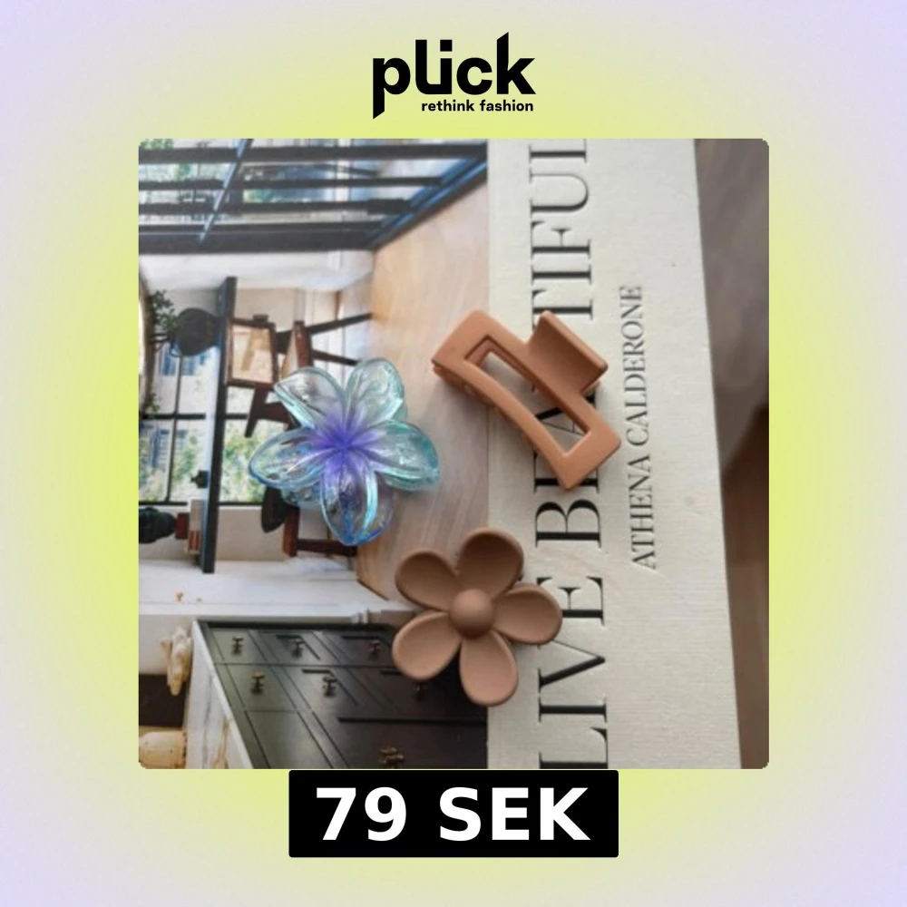 Tre hårklämmor i olika stilar. En genomskinlig blomformad klämma med blå och lila nyanser, en beige klämma i form av en blomma, och en enkel beige klämma med rektangulär form. Perfekta för att sätta upp håret med stil.