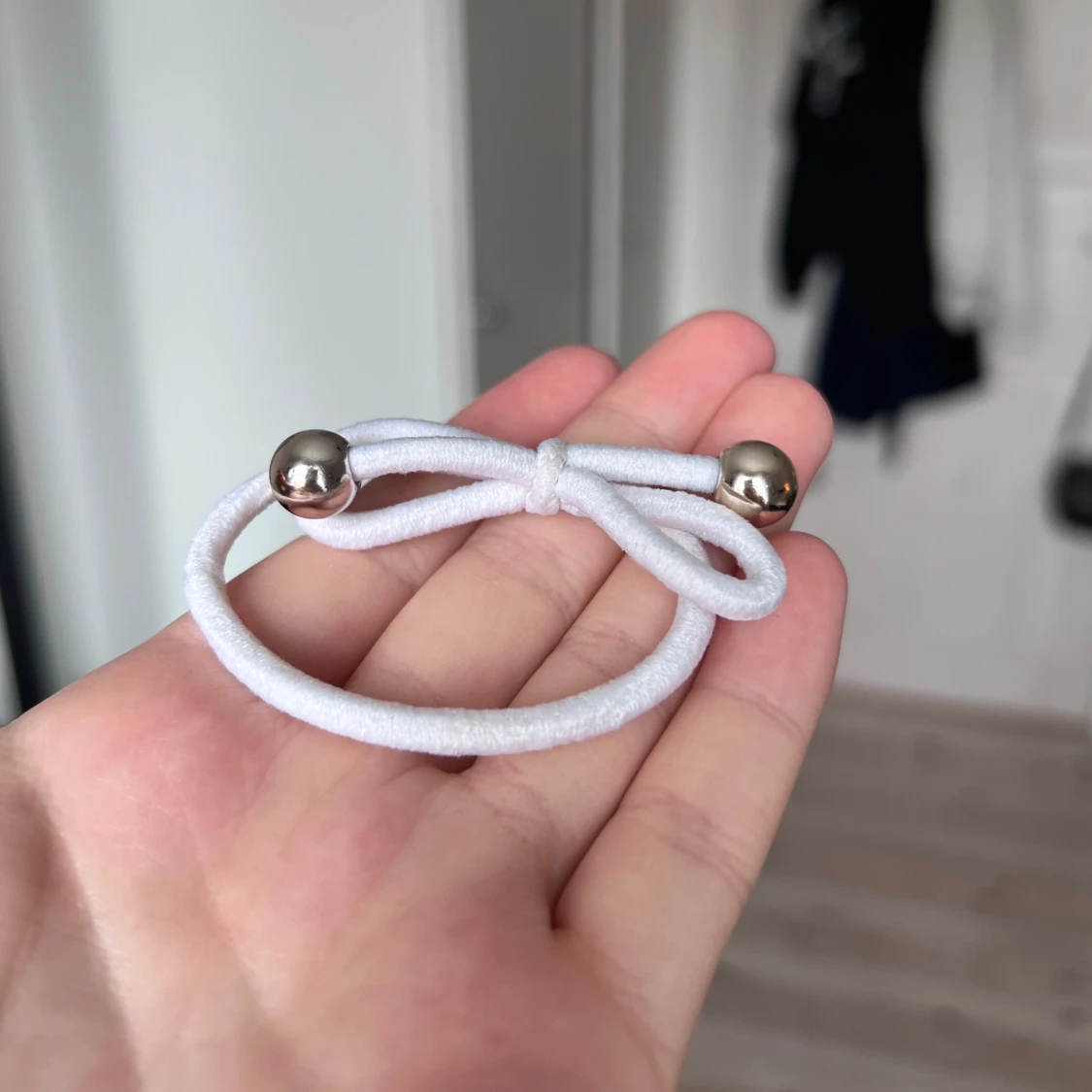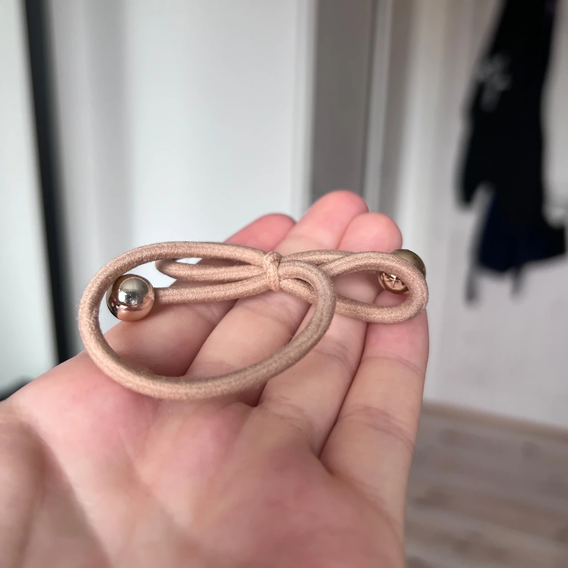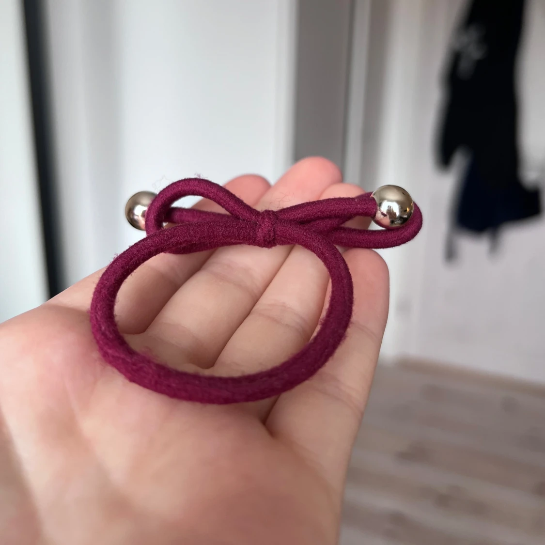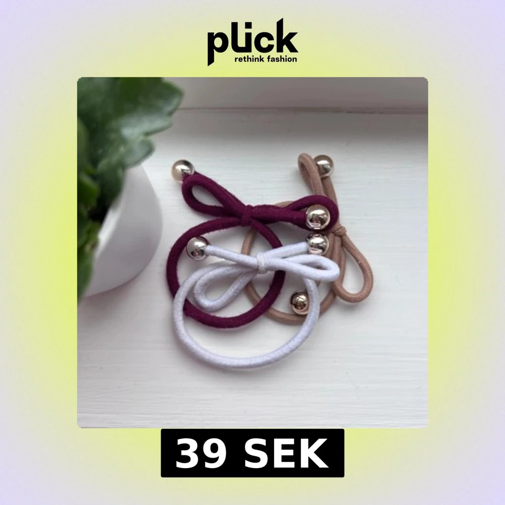 Säljer tre hårsnoddar i olika färger: vinröd, vit och beige. Varje hårband har en söt rosett och är dekorerat med två metallkulor. Perfekt för att ge en extra touch till din frisyr.