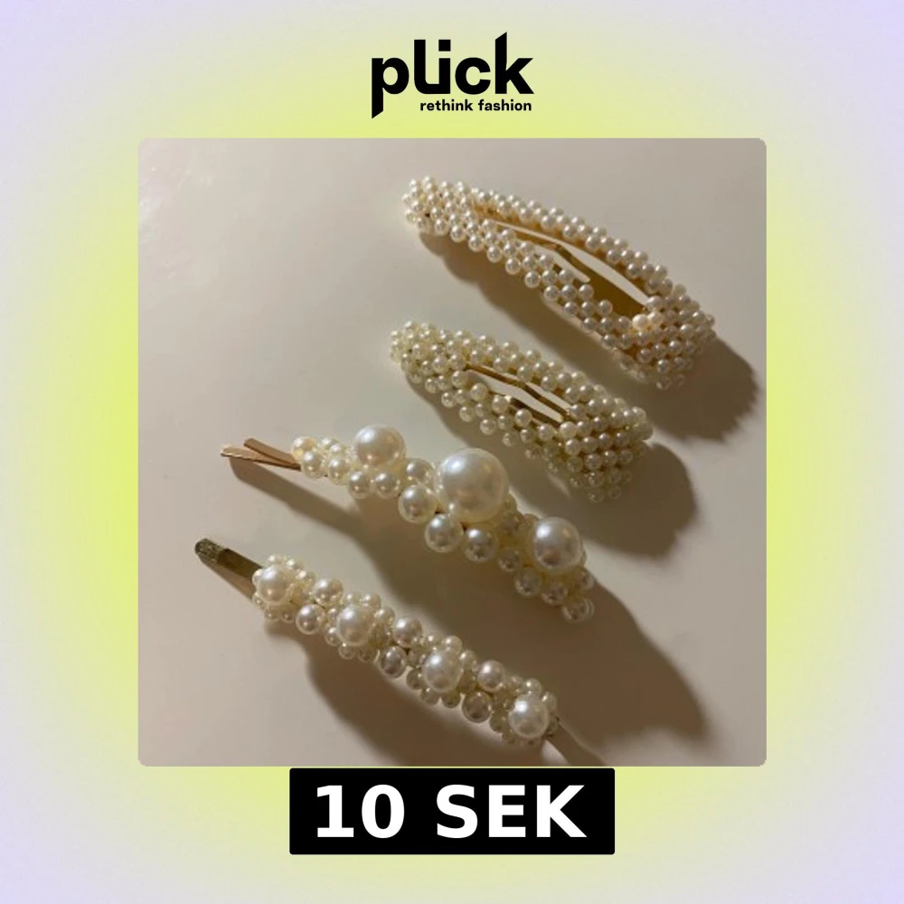 Snygga hårspännen dekorerade med vita pärlor. Perfekta för att ge en elegant touch till din frisyr. Setet innehåller olika former och storlekar av spännen, alla med en glansig finish. Super söta att ha i håret, köpta på shein. 💗