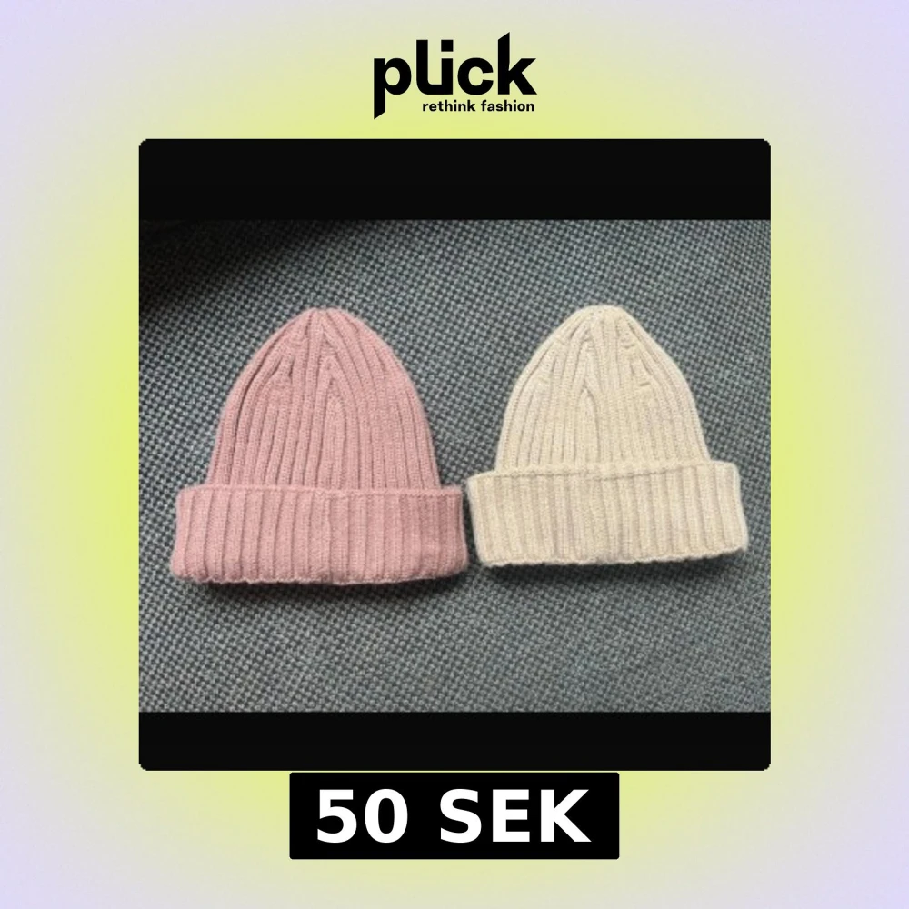 Säljer två ribbstickade mössor med bred uppvikt kant. En i ljusrosa och en i beige, båda i mjukt stickat material. Perfekta för kalla dagar och ger en chill vibe till din outfit.