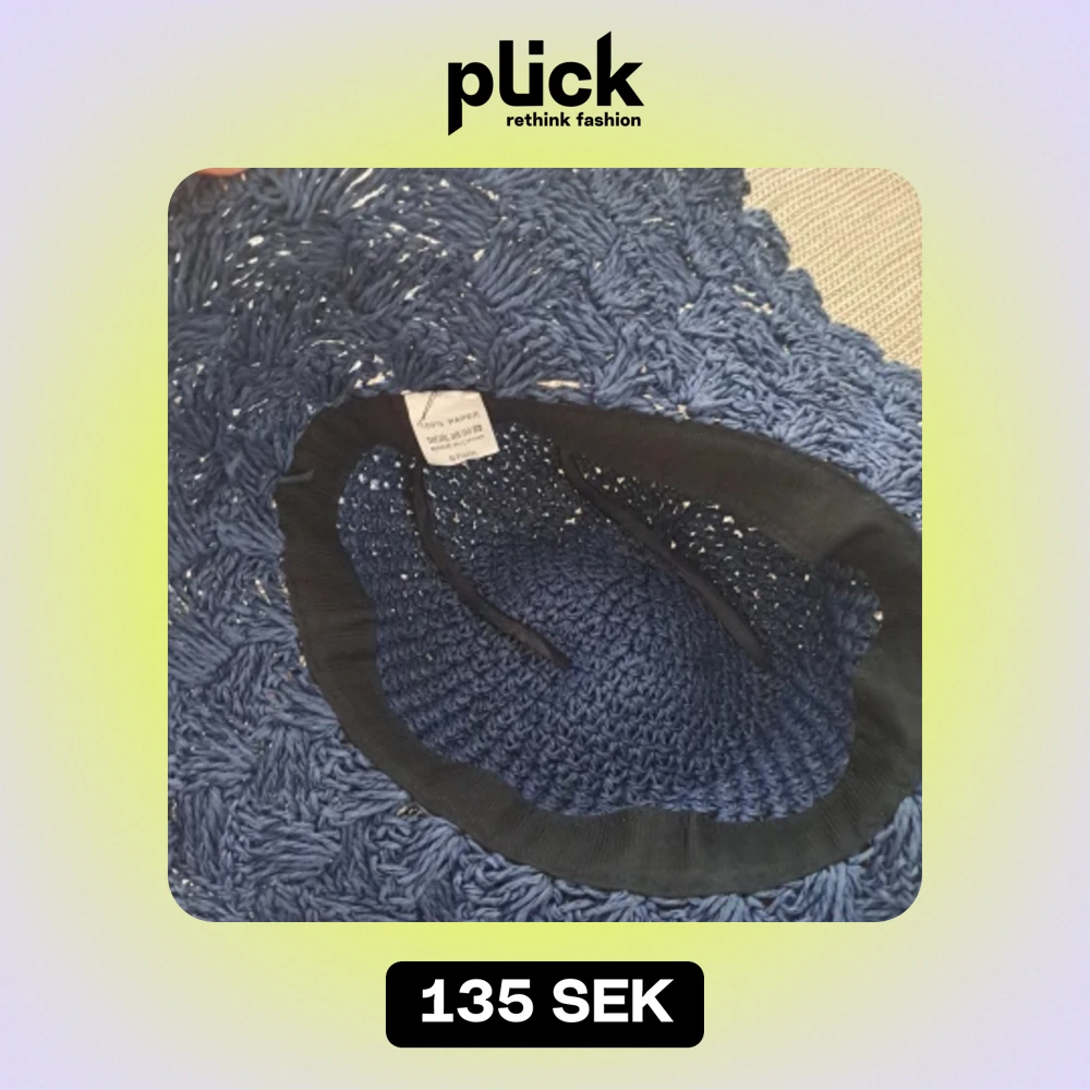 En blå stickad hatt med en dekorativ rosett i brunt band. Hatten har en bred, vågig brätte och är tillverkad av ett flätat material.