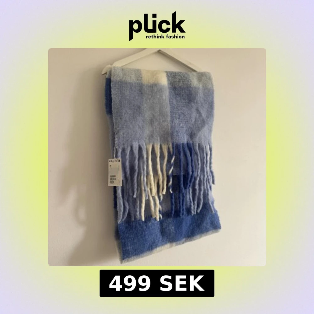 Mysig och fluffig halsduk från & Other Stories i rutigt mönster med olika nyanser av blått och inslag av vitt. Gjord av 83% ansvarsfull ull, med långa fransar i ändarna. Perfekt för att hålla värmen och ge din outfit en cool touch. Helt ny med prislapp kvar. Nypris 1090kr