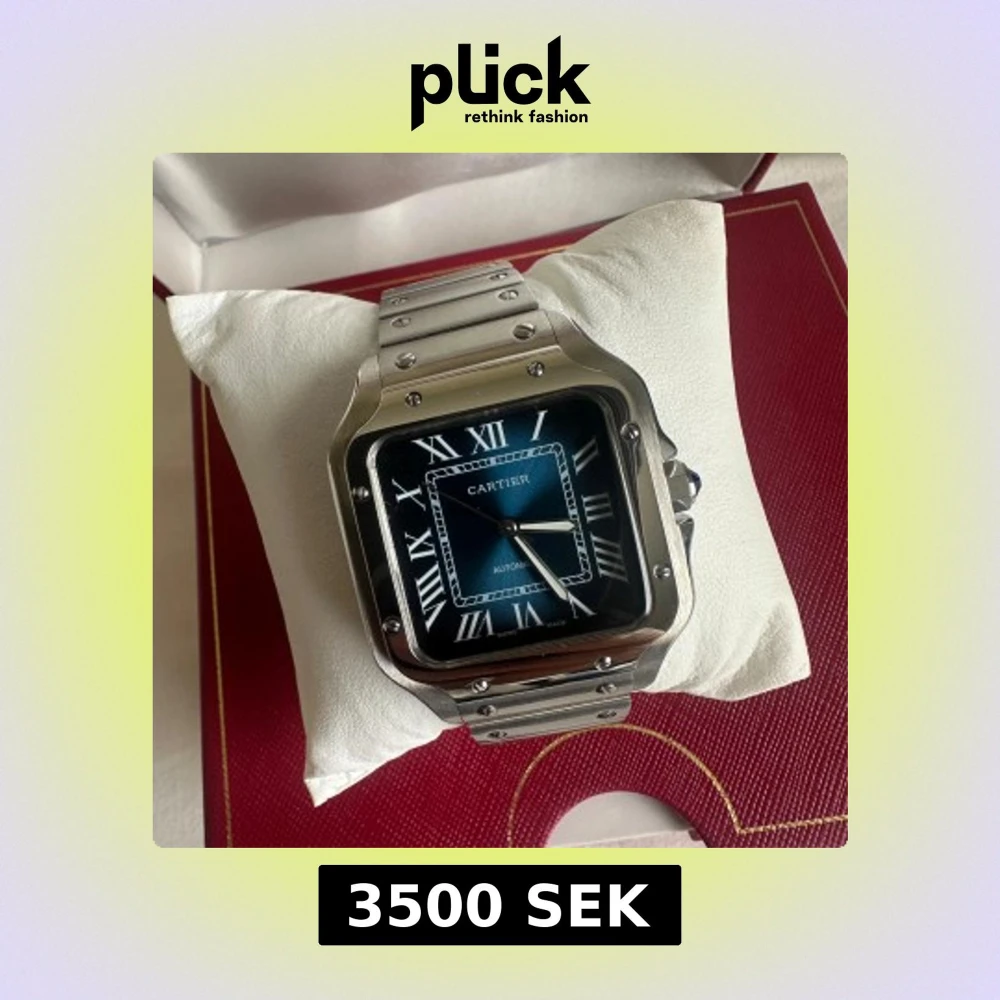 Snygg herrklocka med fyrkantig boett i silverfärgat stål och blå urtavla med romerska siffror. Armbandet är också i stål med synliga skruvar. Kronan har en blå sten som detalj. Automatisk rörelse och klassisk design. Automatisk klocka i mycket bra kvalité, kommer med alla boxar och papper.