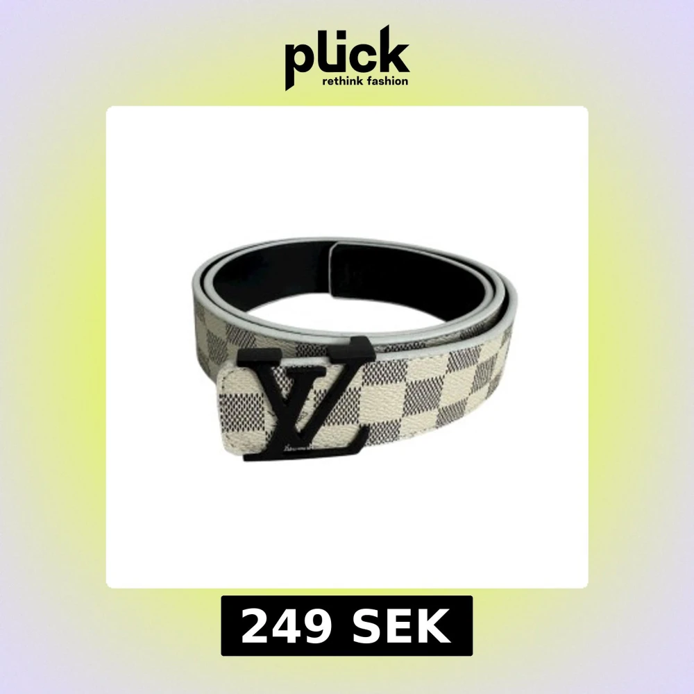 Snyggt Louis Vuitton bälte i svart och beige skinn med klassiskt rutigt Damier-mönster. Bältet har en stilren svart LV-logga som spänne och är tillverkat i Spanien. Perfekt accessoar för att lyfta din outfit med exklusiv känsla.