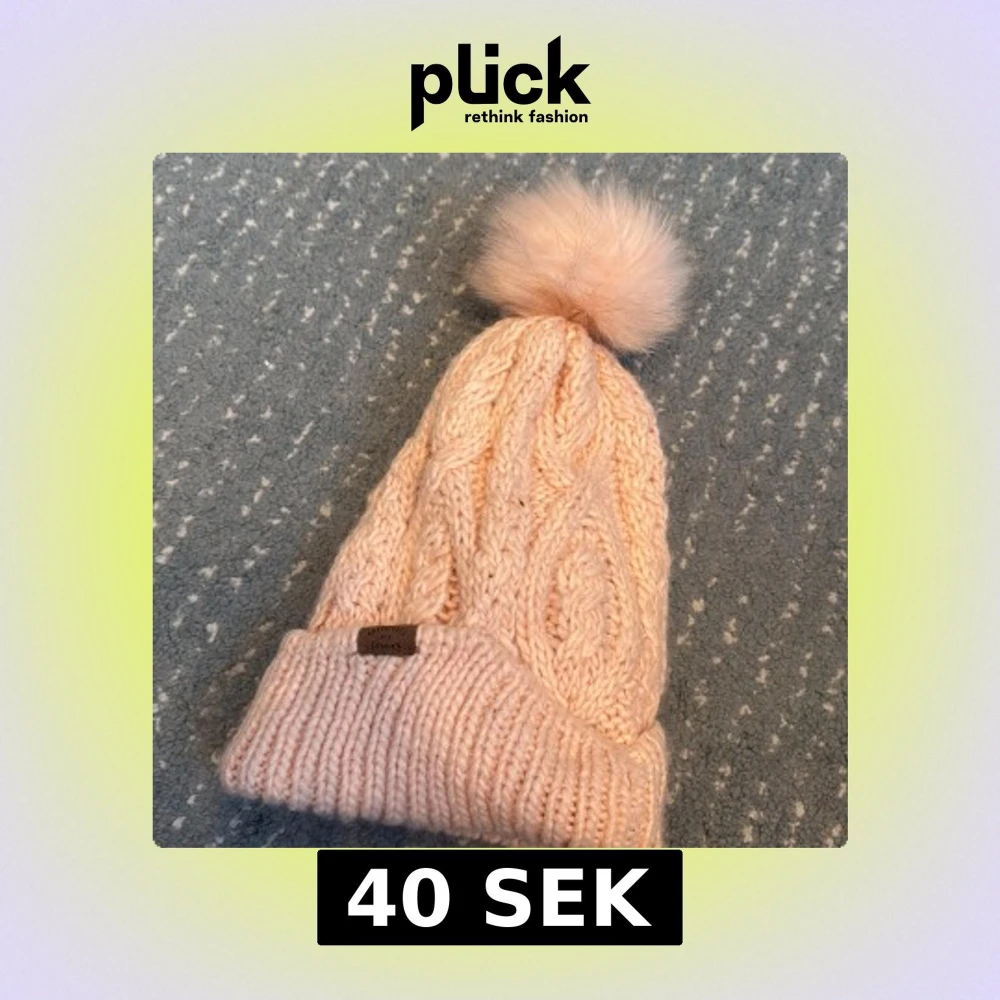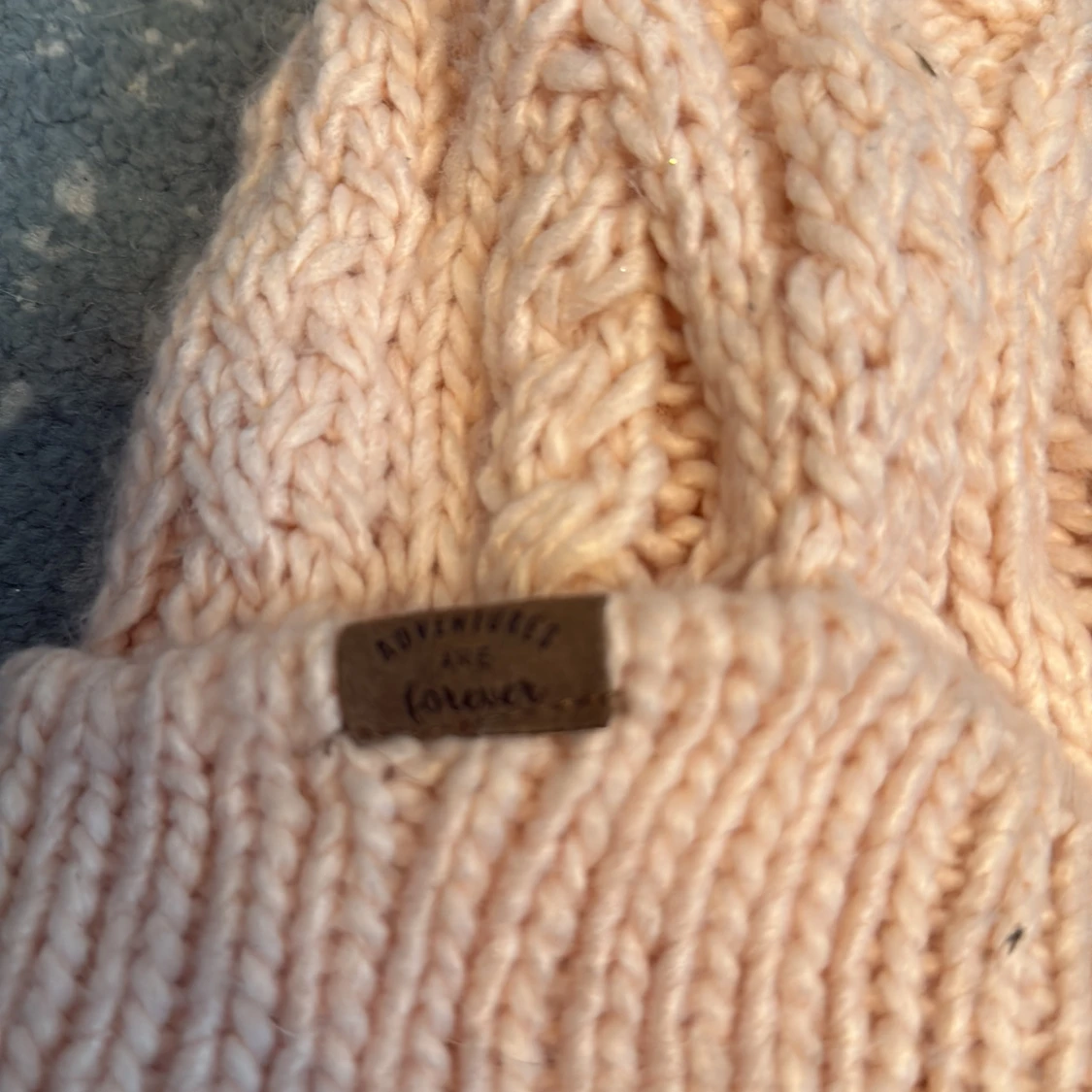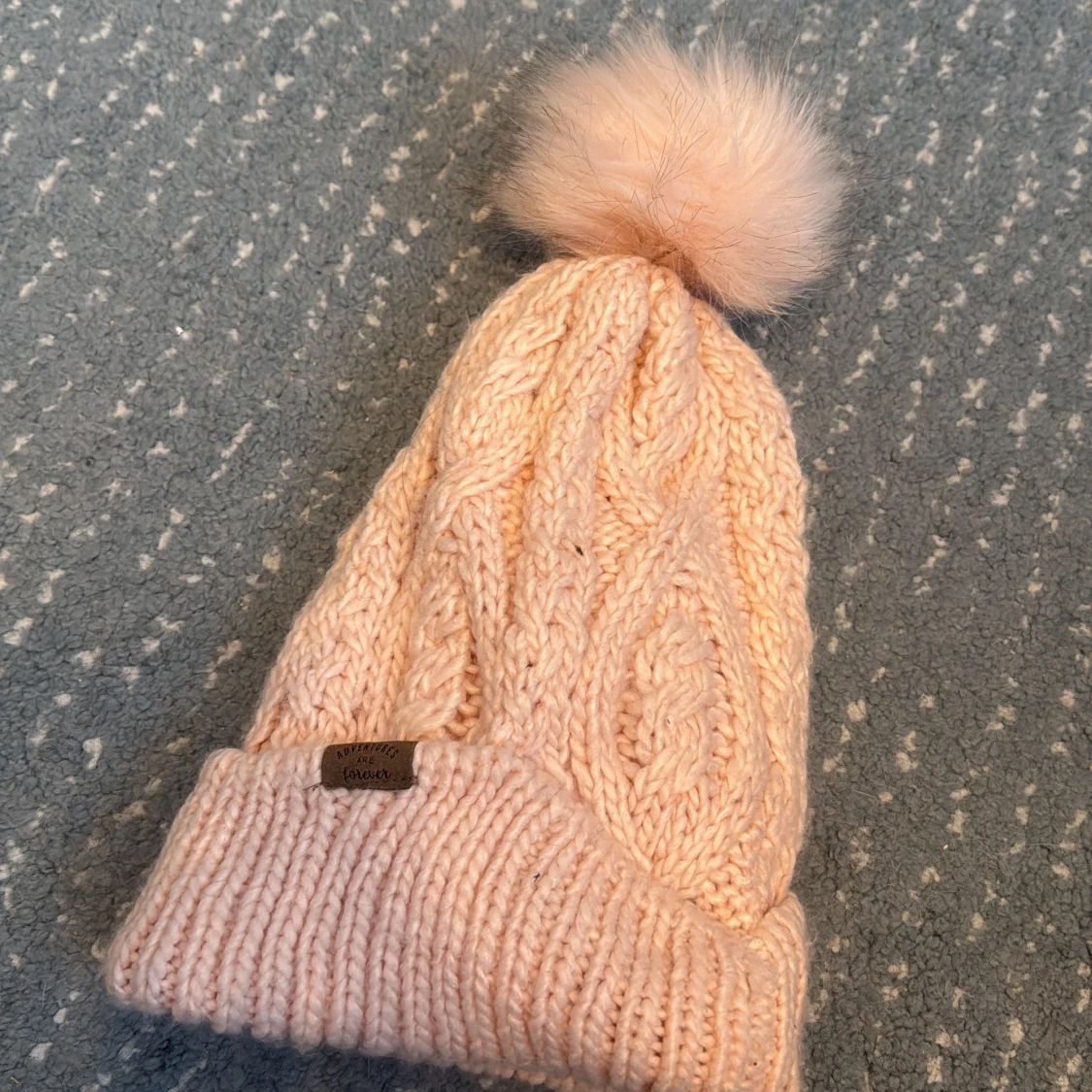 Säljer en supermysig stickad mössa i ljusrosa från H&M, med en fluffig pälsboll på toppen. Mössan har grovstickat flätmönster och uppvikt kant med en liten etikett där det står 'Adventures are forever'. Perfekt för kalla dagar och riktigt snygg till vinterlooken.