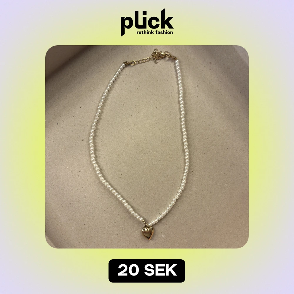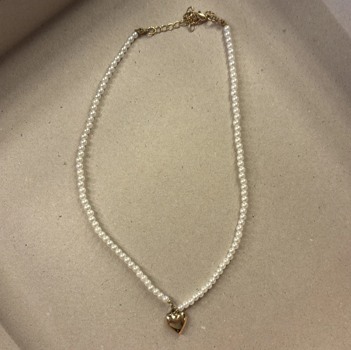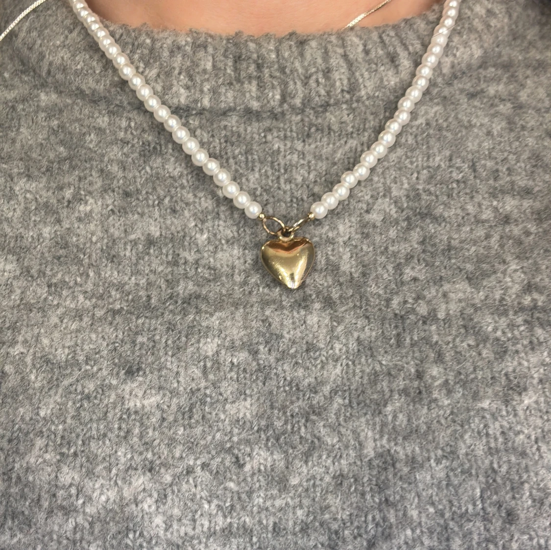Säljer ett elegant pärlhalsband med ett guldigt hjärthänge. Halsbandet har små vita pärlor och en justerbar kedja för perfekt passform. Perfekt för att ge en romantisk touch till din outfit. Passar både till vardags och festliga tillfällen.