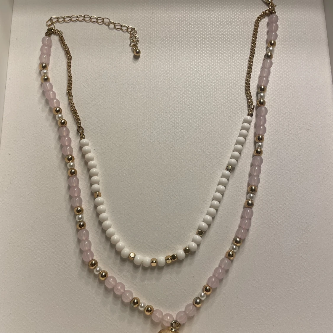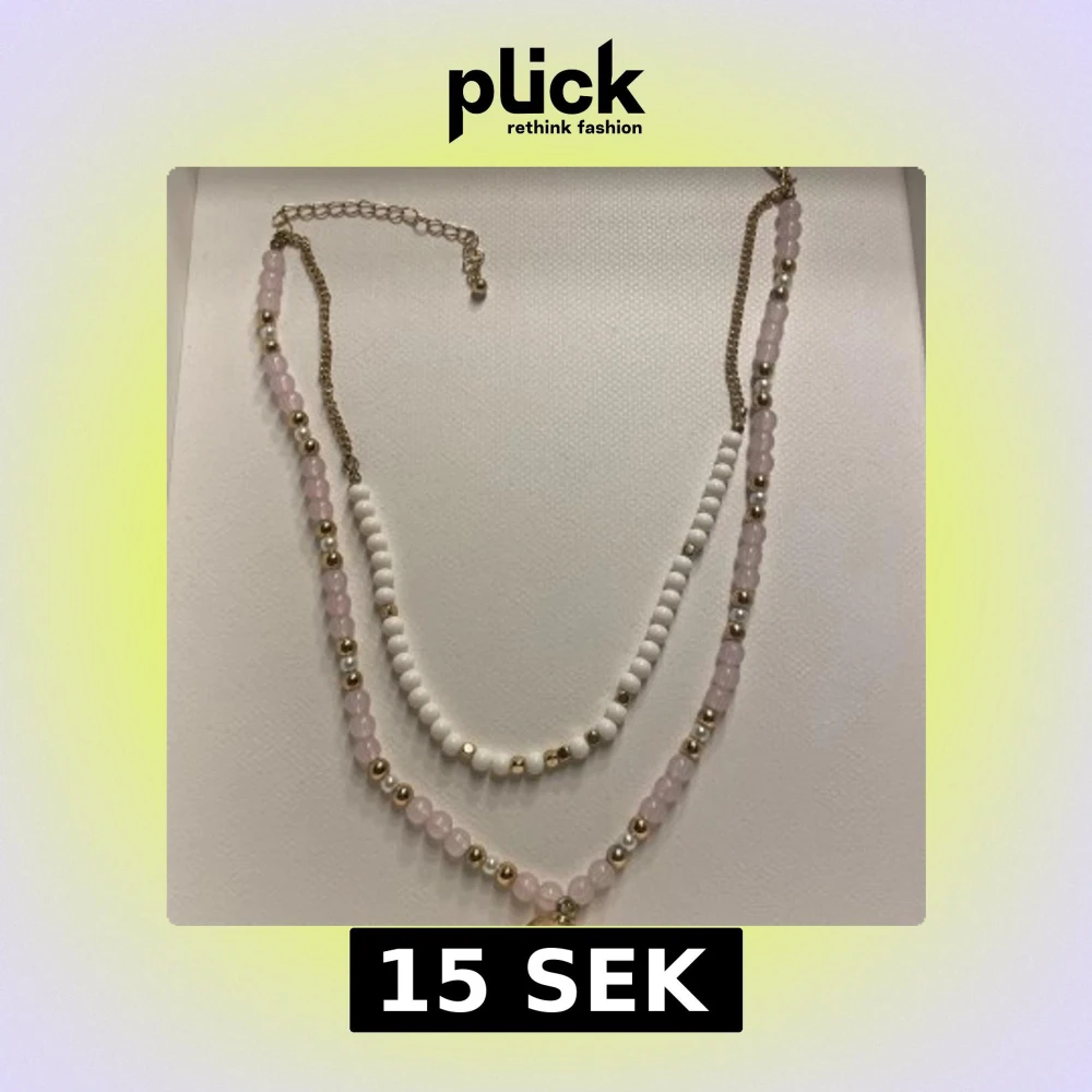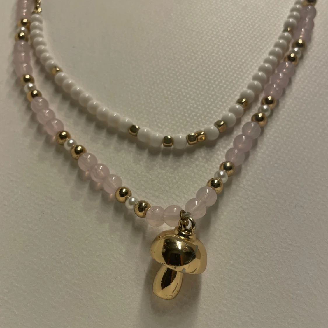 Säljer ett dubbel halsband med pärlor i ljuslila, vitt och guld. Ena kedjan har vita pärlor och små guldfärgade detaljer, den andra har ljuslila pärlor och guldfärgade kulor samt en gullig svampberlock i guld. Perfekt för att ge din outfit en söt och lekfull touch. Använd ett fåtal gånger och har fått små slitningar på berlocken, men inget som syns tydligt