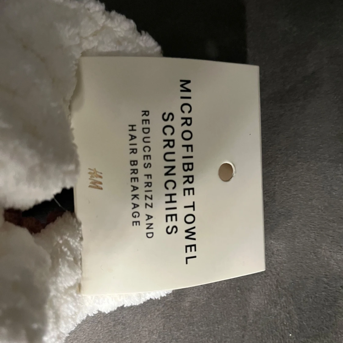 Två fluffiga scrunchies i mikrofiber från H&M, en i vit och en i ljusrosa. Perfekta för att minska friss och hårslitage. De är mjuka och har en handduksliknande textur som känns skön i håret.
