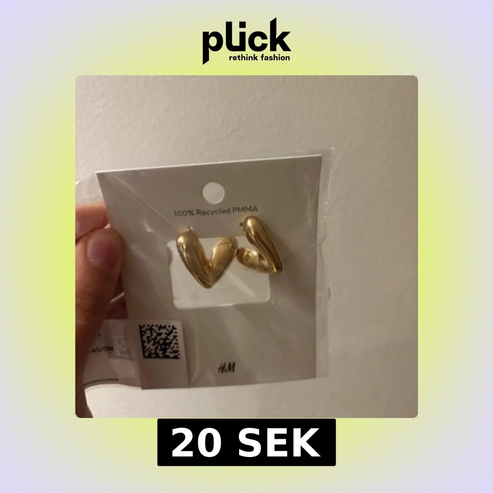Snygga örhängen från H&M i glansig guldig färg, formade som hjärtan. De är chunky och tillverkade av 100% återvunnet PMMA, vilket ger en cool och modern vibe. Perfekta för att lyfta vilken outfit som helst med en trendig touch.