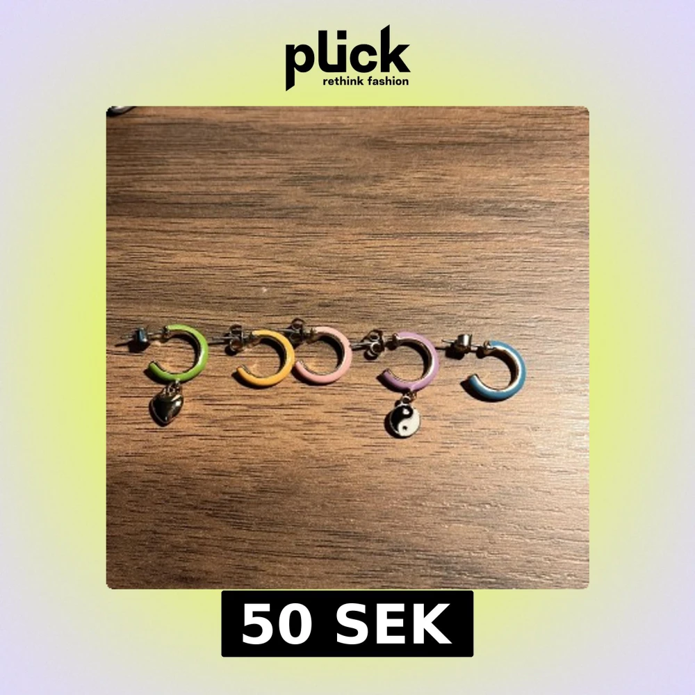 Säljer ett set med fem färgglada örhängen i olika färger: grönt, orange, ljus rosa, lila och blått. Två av örhängena har berlocker, ett med ett hjärta och ett med yin-yang symbol. Perfekt för att mixa och matcha!