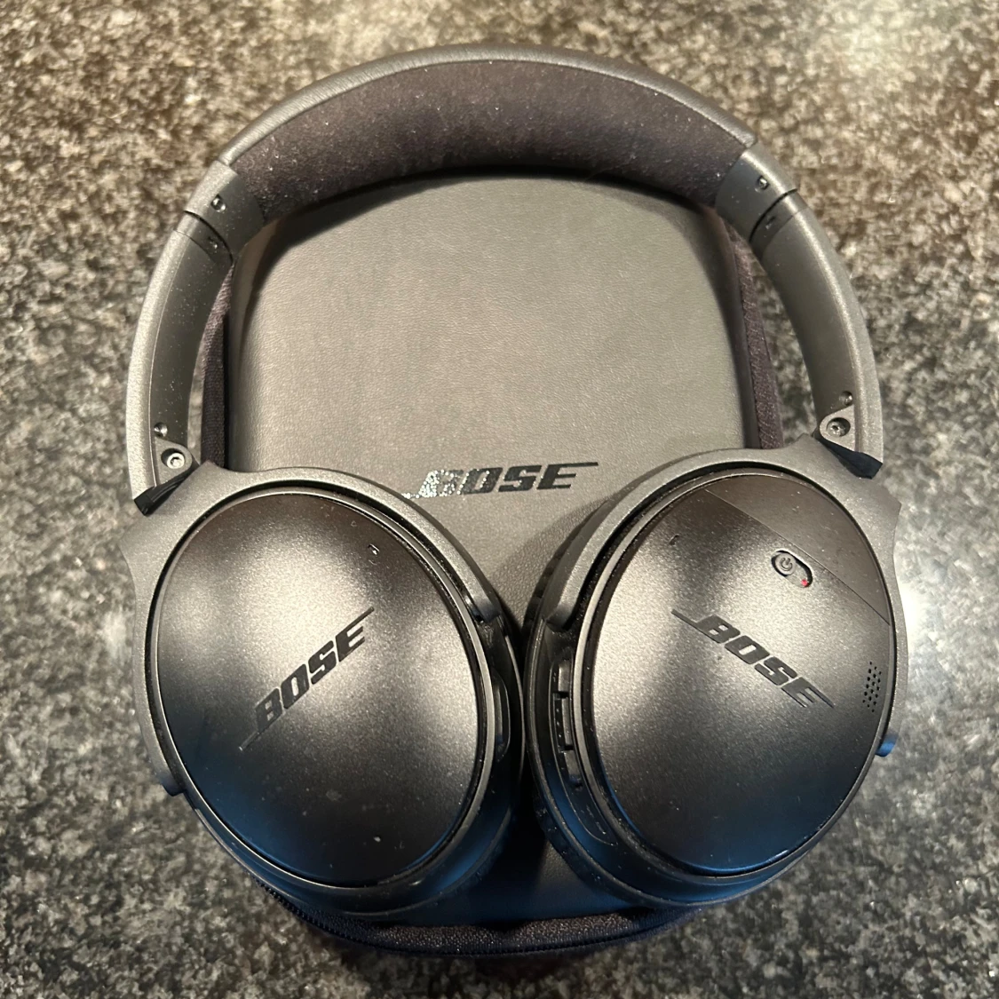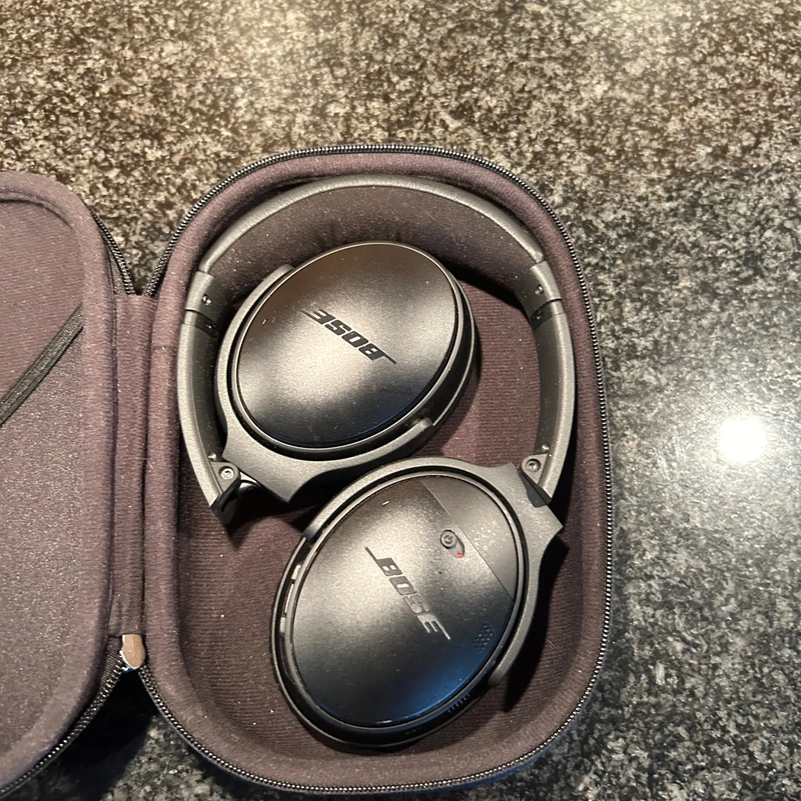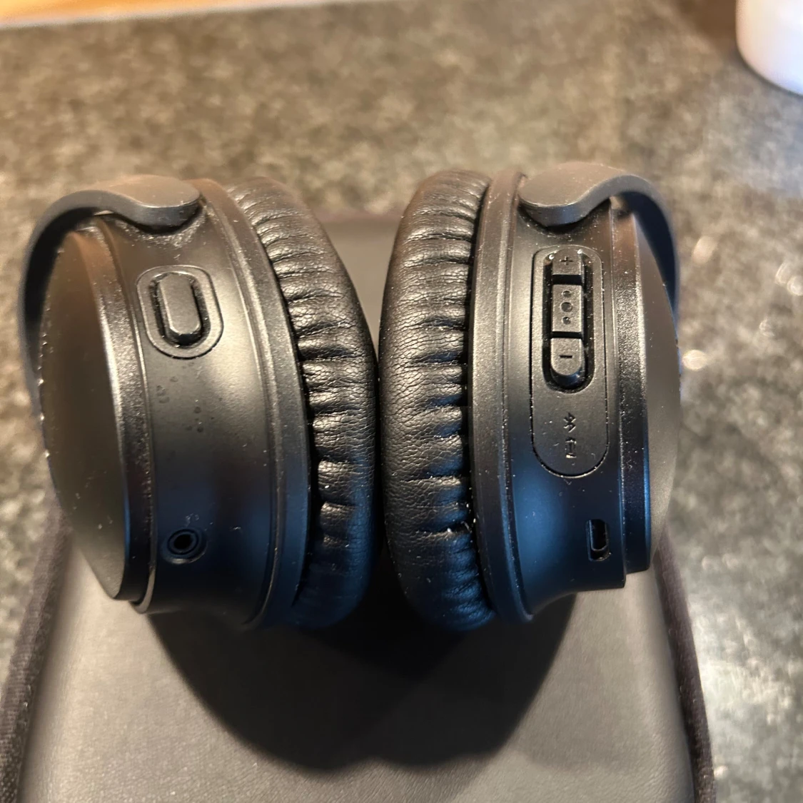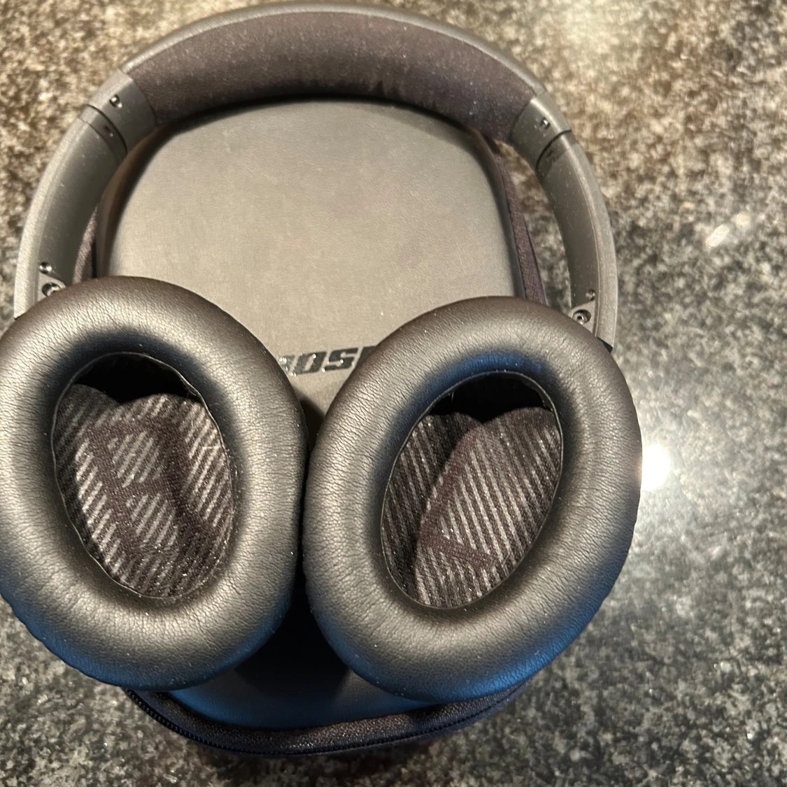 Säljer ett par svarta Bose hörlurar i nyskick. De kommer med ett matchande fodral för enkel förvaring och transport. Hörlurarna är over-ear och har mjuka kuddar för bekväm användning under längre perioder. Perfekta för musik, poddar eller att stänga ute omgivande ljud.