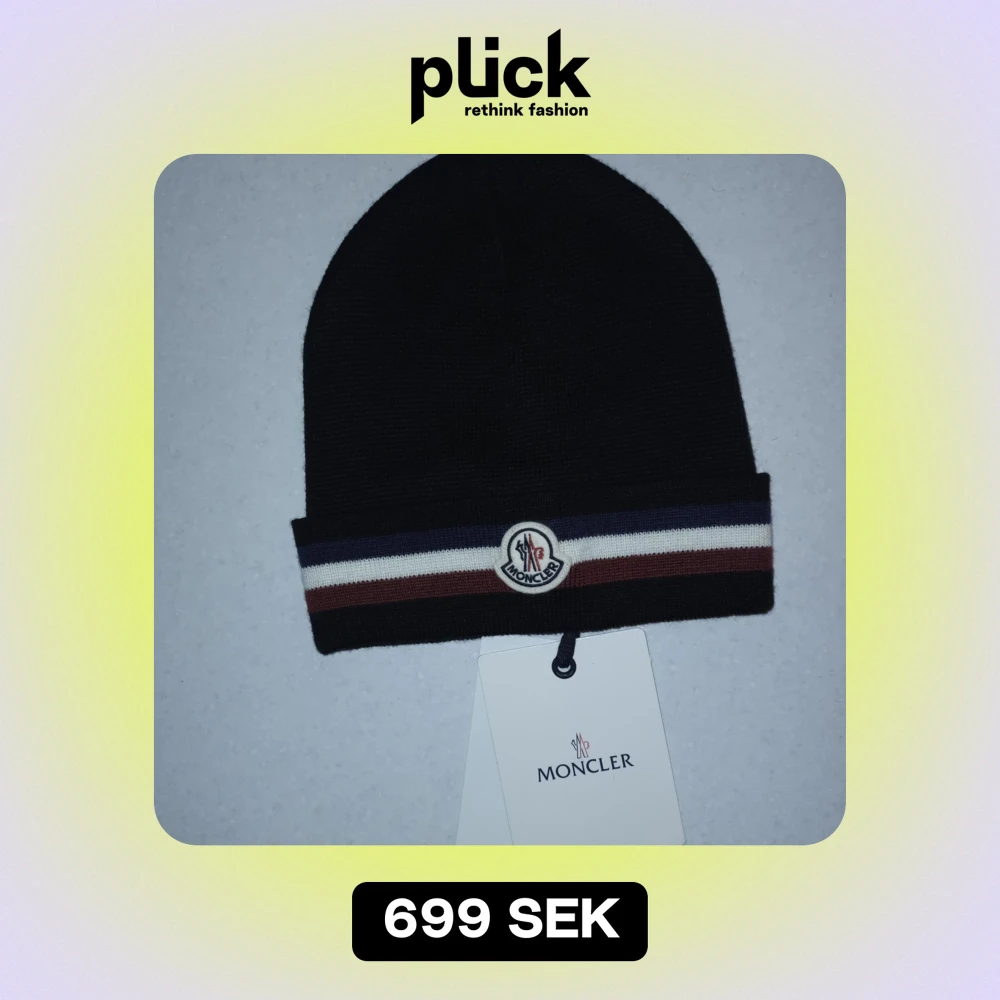 Säljer en snygg svart mössa från Moncler med klassiska ränder i vitt, blått och rött. Den är i nyskick och har en broderad Moncler-logga framtill. Perfekt för att hålla sig varm och stilren under kyliga dagar. Passar både till vardags och mer uppklädda tillfällen.