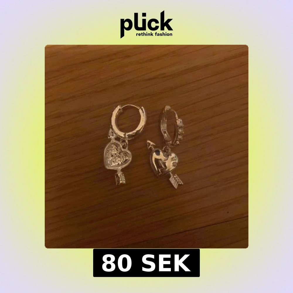 Säljer ett par snygga örhängen i silverfärg med hängande hjärtan som har blixtformad spricka och pil genom sig. Ringen har små glittriga stenar på framsidan för extra bling. Perfekt accessoar för att sticka ut lite extra. Aldrig använda