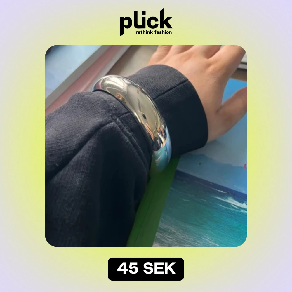 Säljer ett stilrent och glänsande silverfärgat armband. Det är brett och har en slät yta som reflekterar ljuset snyggt. Perfekt för att ge en elegant touch till vilken outfit som helst!