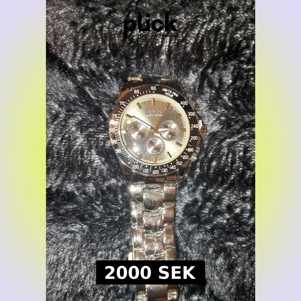 Säljer en stilren kronografklocka från Hugo Boss i silverfärgat metall med länkarmband. Urtavlan har tre mindre visare och markerade index, samt svart ring med vita siffror runt boetten. Boss-logga på både urtavla och spänne. Perfekt för dig som gillar klassisk design. Helt ny med plastet på