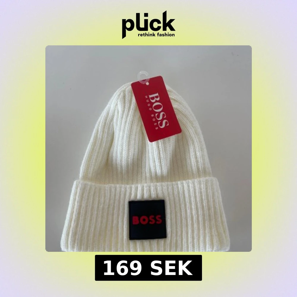 Vit ribbstickad mössa från Hugo med bred uppvikt kant och svart patch framtill med röd logga. Snygg och enkel design som lyfter din vinterstil. Perfekt för dig som gillar cleana accessoarer med tydlig branding.