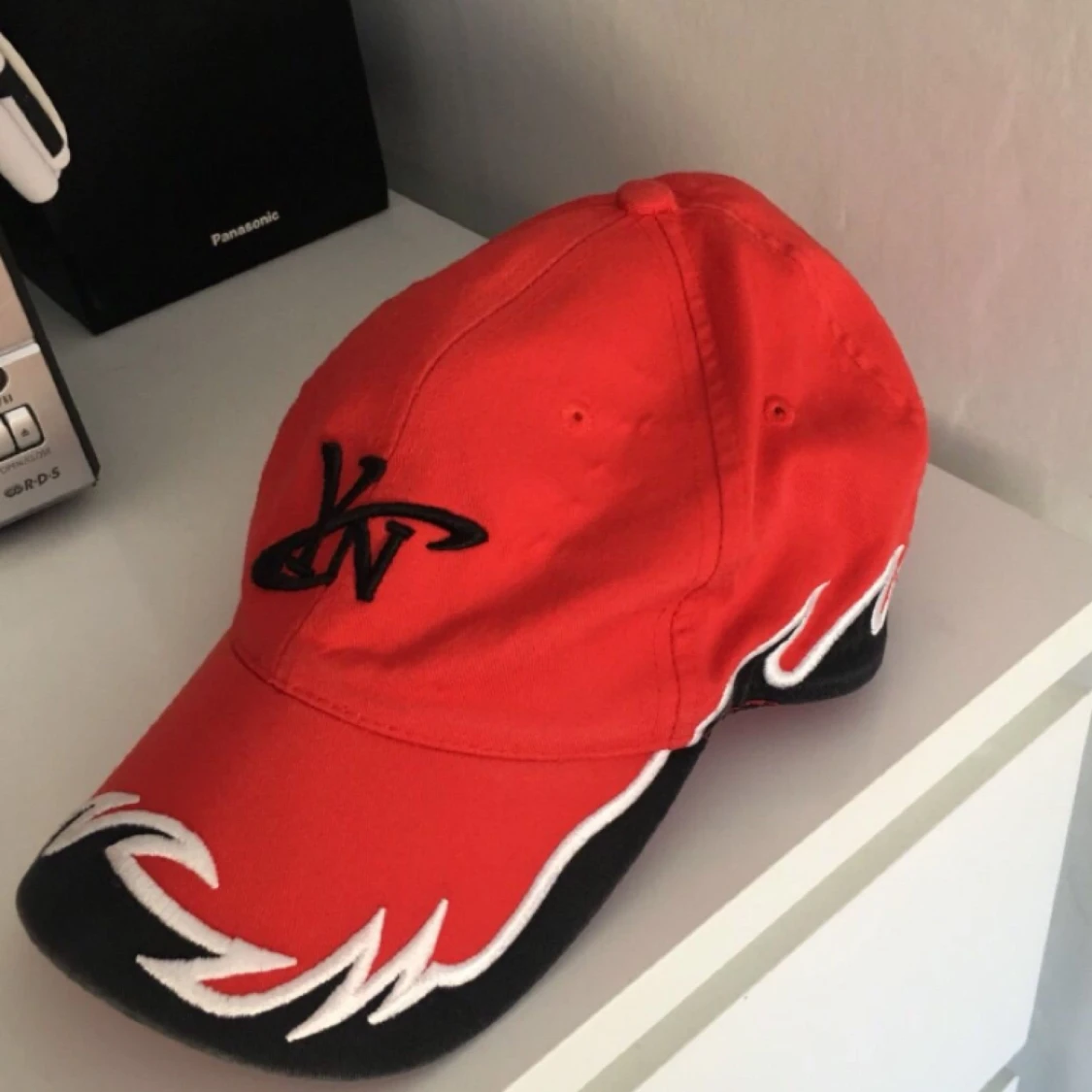 Röd keps med tryck och detaljer. Justerbar storleksrem på baksidan. Använd en gång.