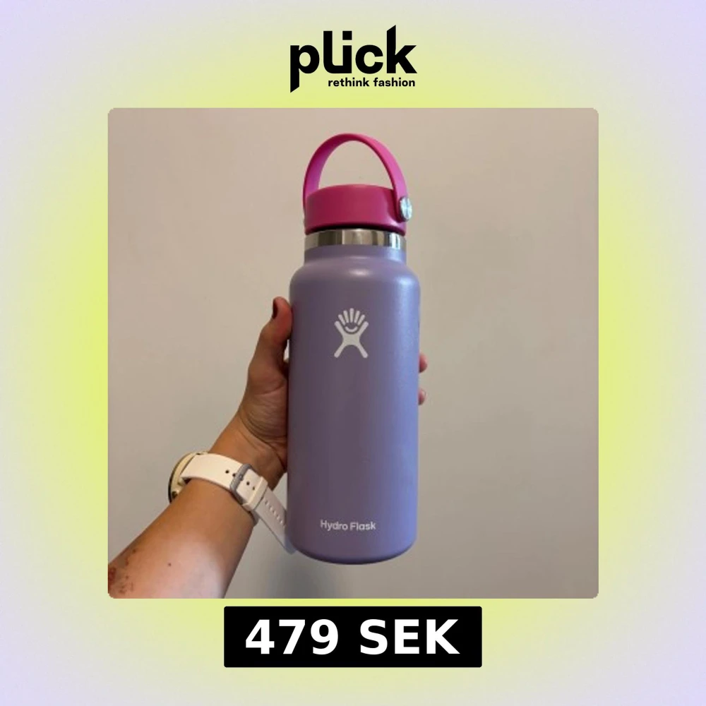 Snygg Hydro Flask vattenflaska i lila med rosa lock, 32oz (946ml). Flaskan är diskmaskinssäker och i gott skick, med endast mindre märken på botten. Perfekt för både vardag och träning, håller drycken kall eller varm länge. Har lite klister från klistermärken men de stör inte funktionen alls och går att tvätta bort