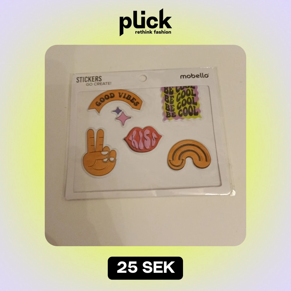 Säljer ett set med coola klistermärken från Mobello. Perfekt för att dekorera din telefon, laptop eller andra tillbehör. Setet innehåller färgglada motiv som 'Good Vibes', 'Be Cool', en peace-hand, läppar och en regnbåge. Gör dina prylar unika och personliga med dessa stickers!